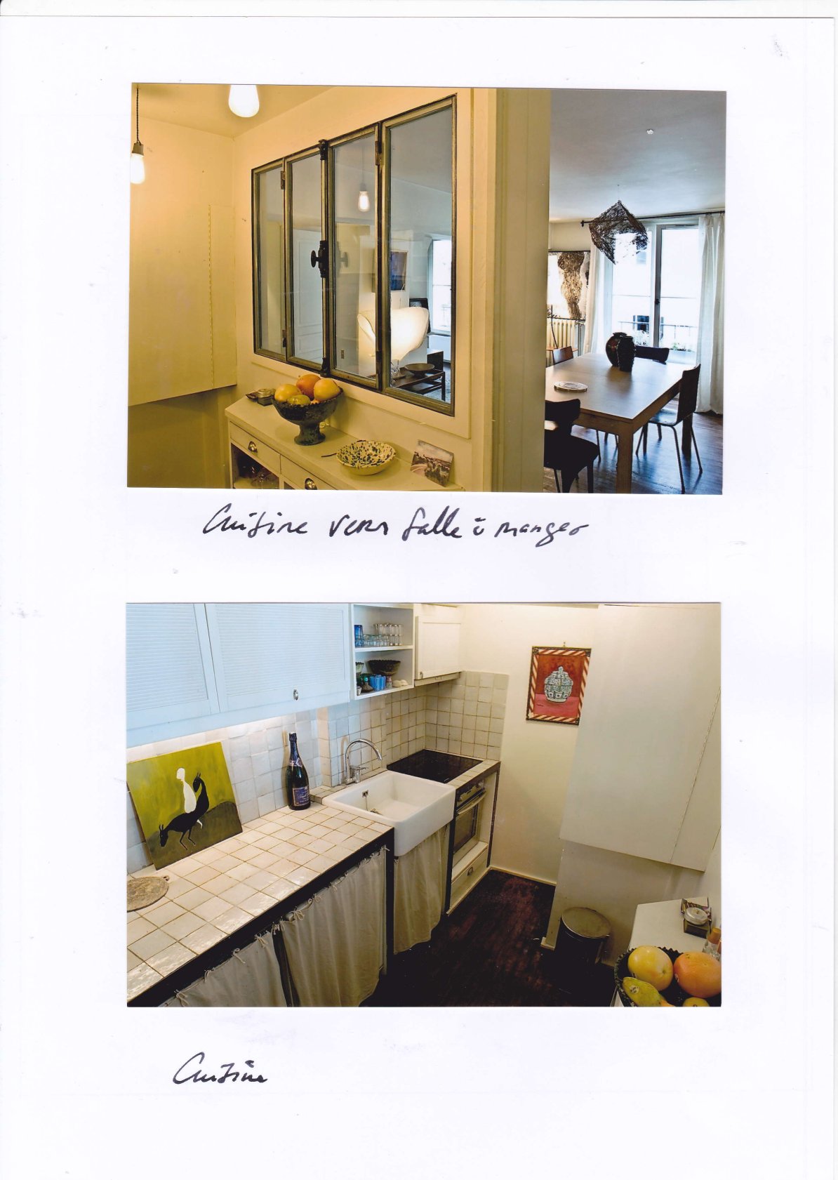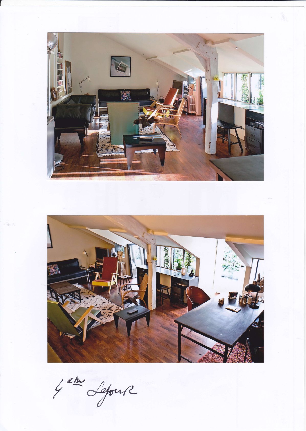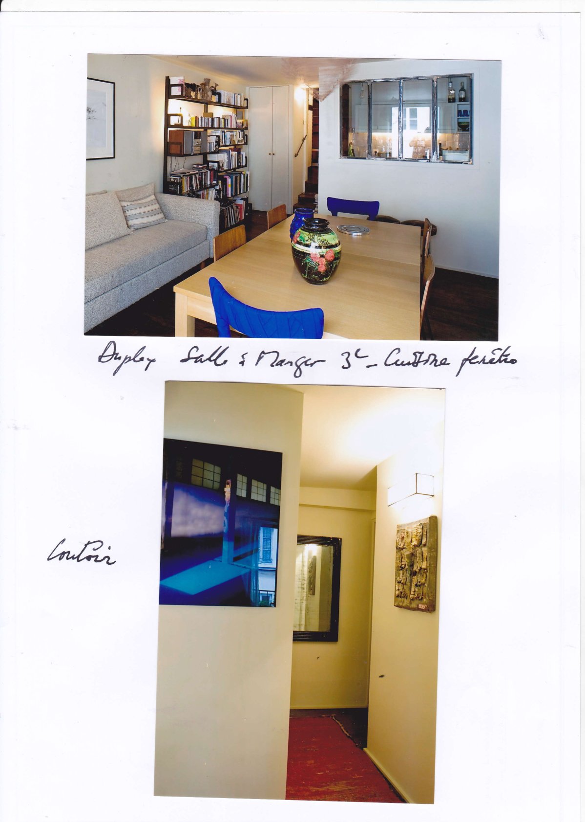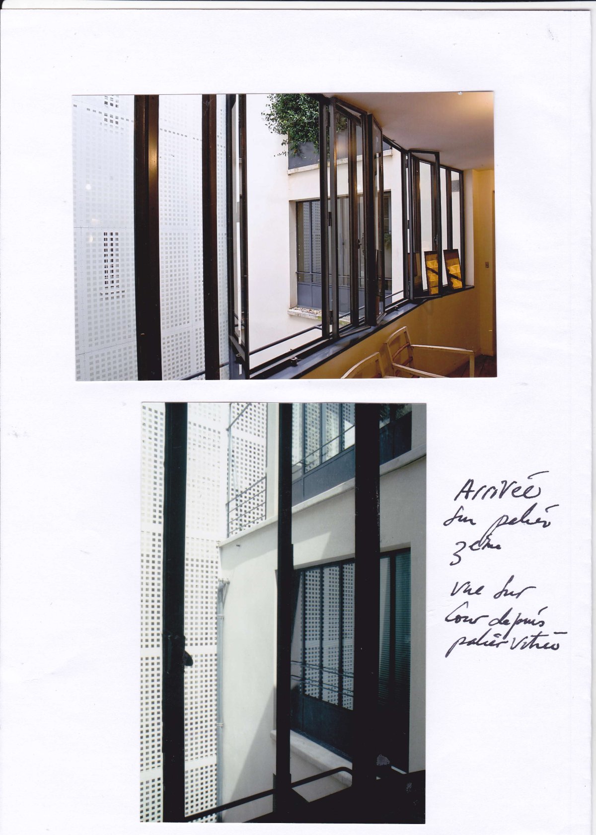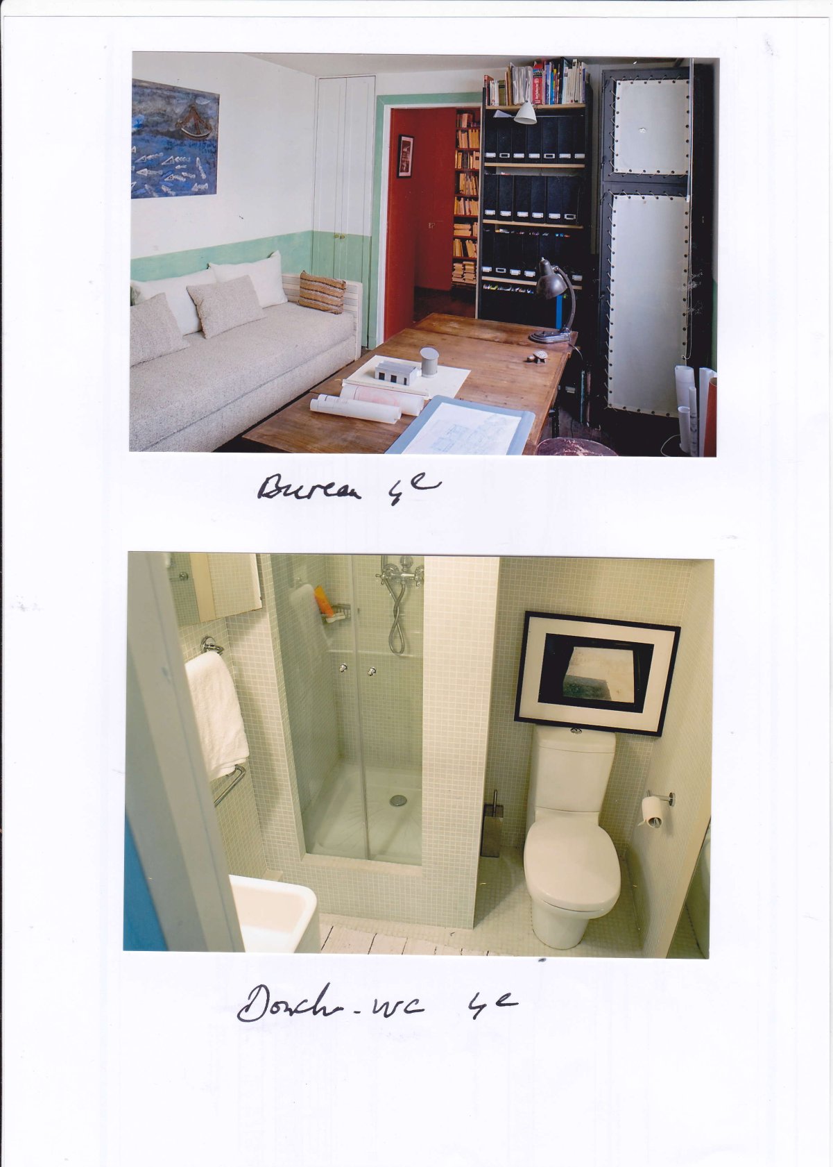 Le dossier commence par photos des lieux habités par l’arrivée au 4éme étage sur le palier transparent vers la cour fermée par son claustra métallique blanc, succèdent des photos du séjour/salon avec la terrasse et le bureau sur cour avec sa salle de douche et WC.