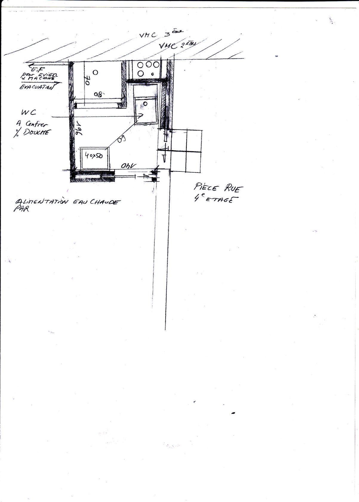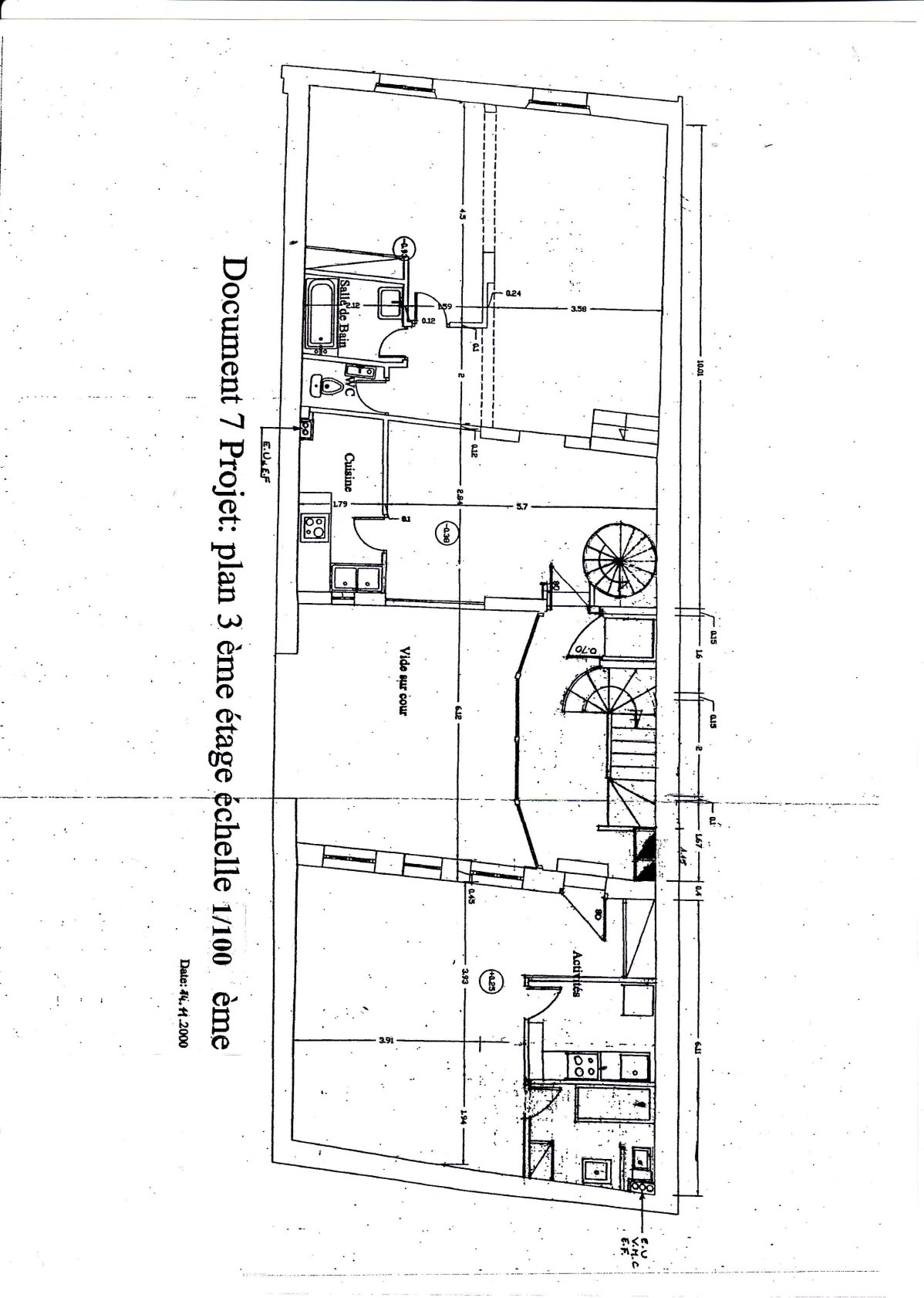 En prenant l’escalier hélicoïdal on arrive au 3éme avec la même entrée avec porte palière qui distribue à gauche une chambre sur cour avec sa douche et WC et en avant sur rue une salle à manger avec cuisine avec fenêtre ouverte sur cet espace qui forme un tout. D’où une cuisine non confinée bien que de taille réduite mais très fonctionnelle. Une circulation amène à une chambre séparable par porte coulissante ,une salle de bains et des toilettes séparées.