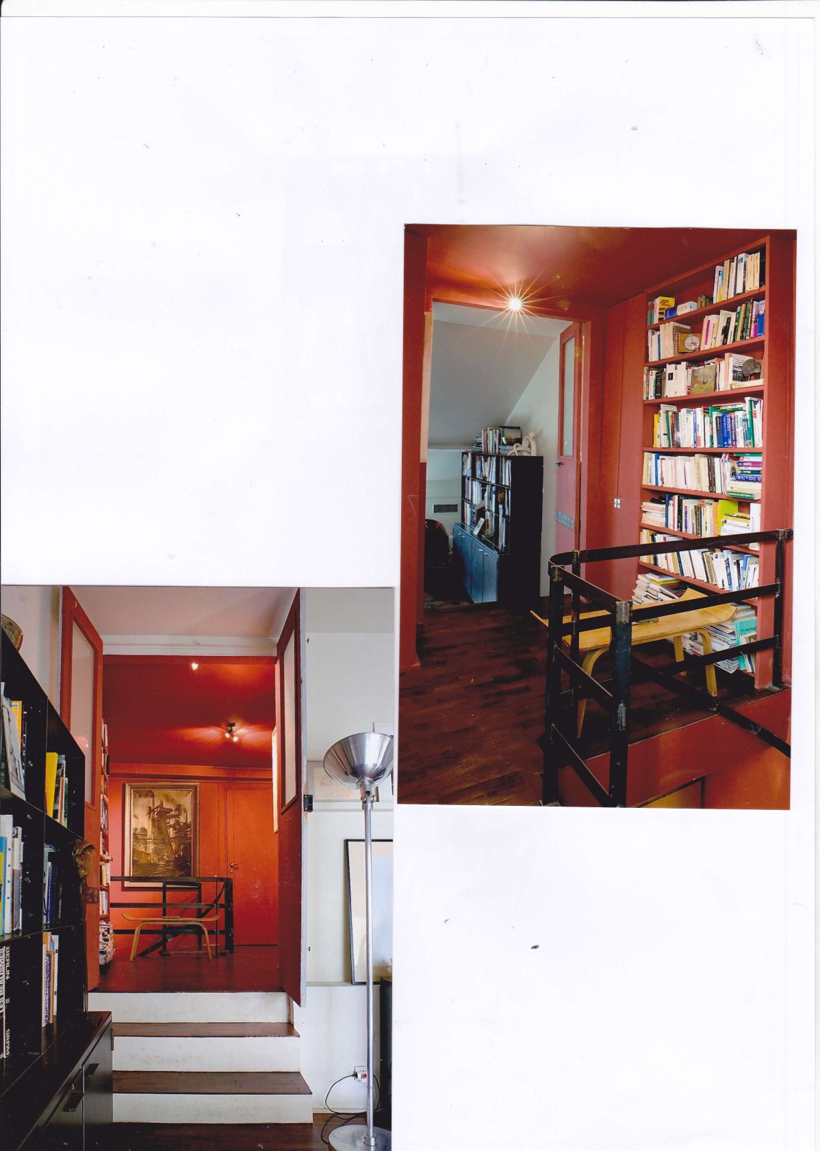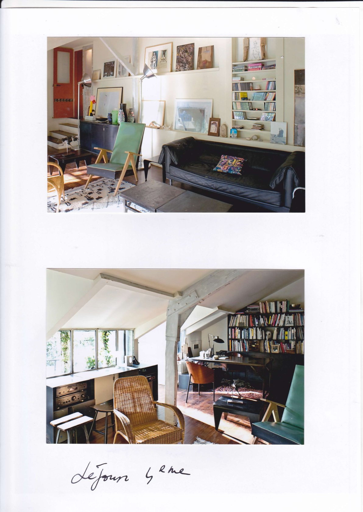 Les meubles et sièges sont d’origine diverses, les meubles métalliques ont été dessinés par moi-même dans le séjour/salon et une double bibliothèque en métal a été trouvée aux puces de Clignancourt.
