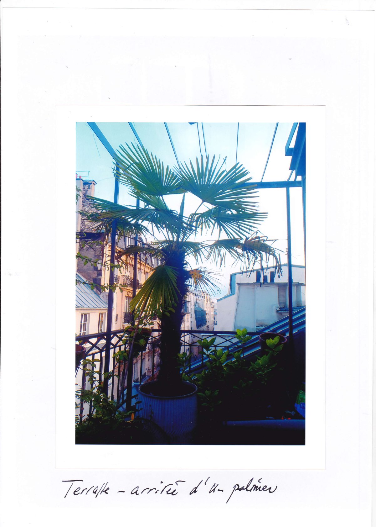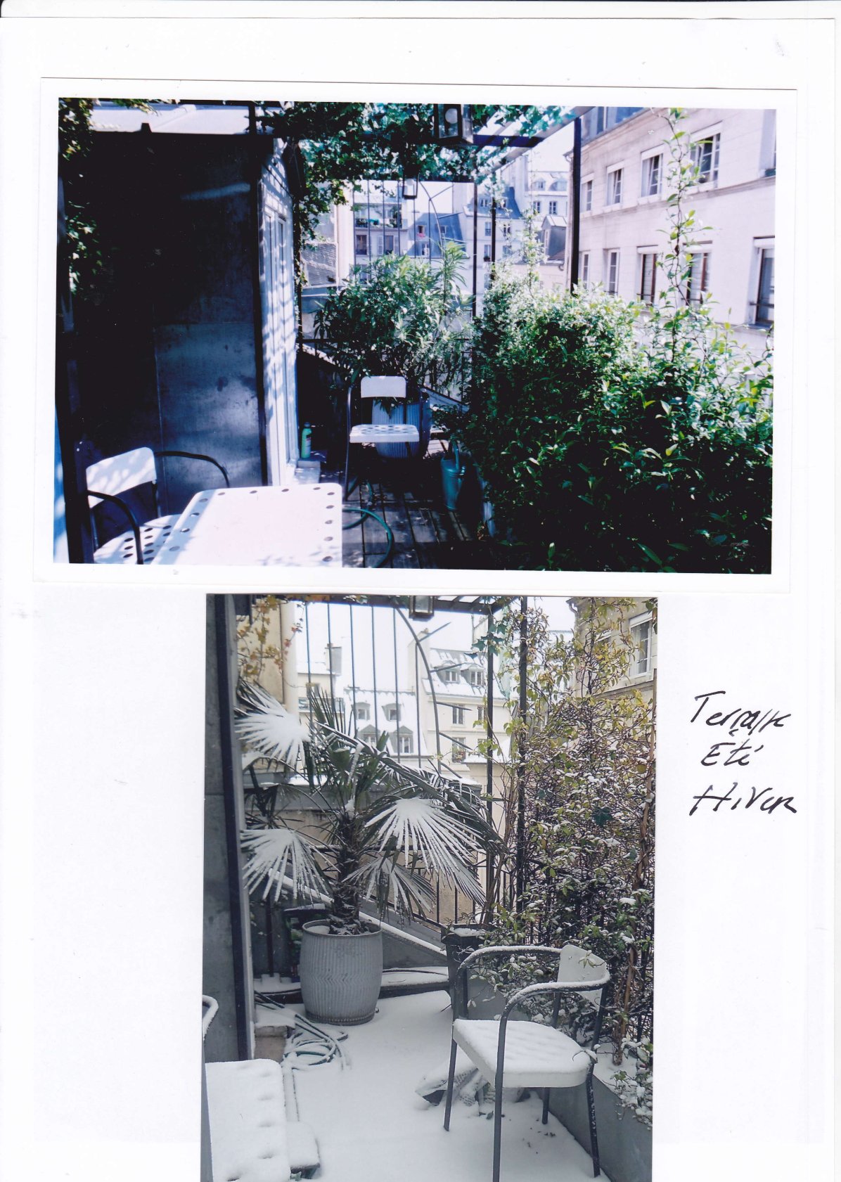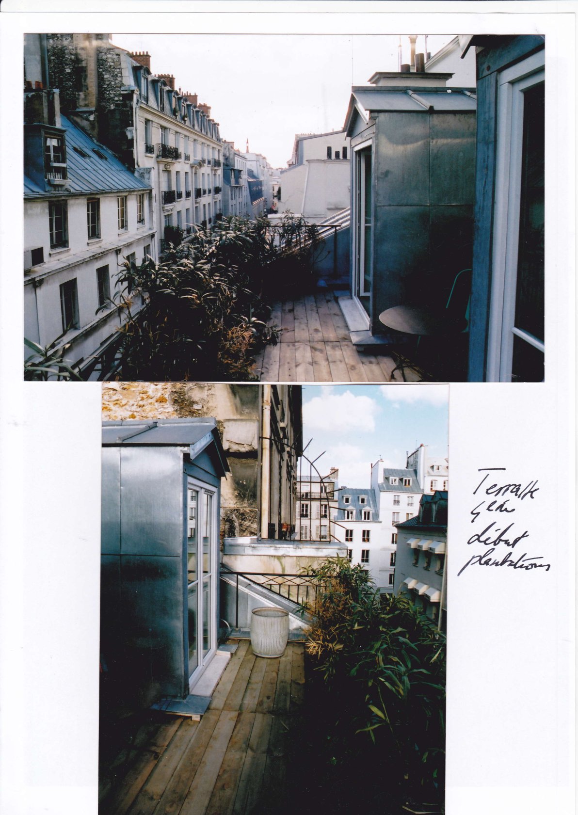 L’appartement au 4éme s’ouvre sur une entrée avec l’escalier puis à gauche vers un bureau/chambre d’appoint avec douche et toilettes, en avant une assez grande pièce sur rue avec son pan de toiture inclinée avec. 2 fenêtres et châssis vitrés sur toute la façade pour se prolonger par une terrasse avec table et chaises pour les bons moments et aujourd’hui 2 palmiers et chèvrefeuille et jasmin en bacs.