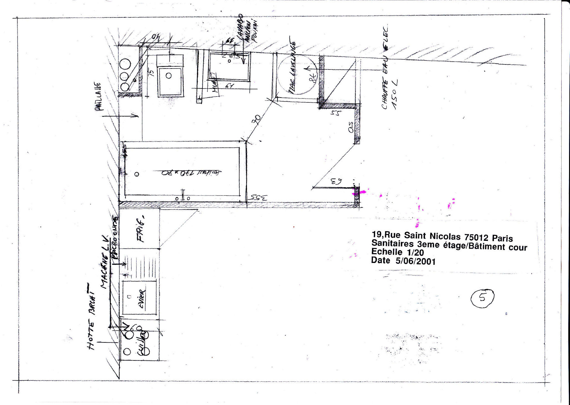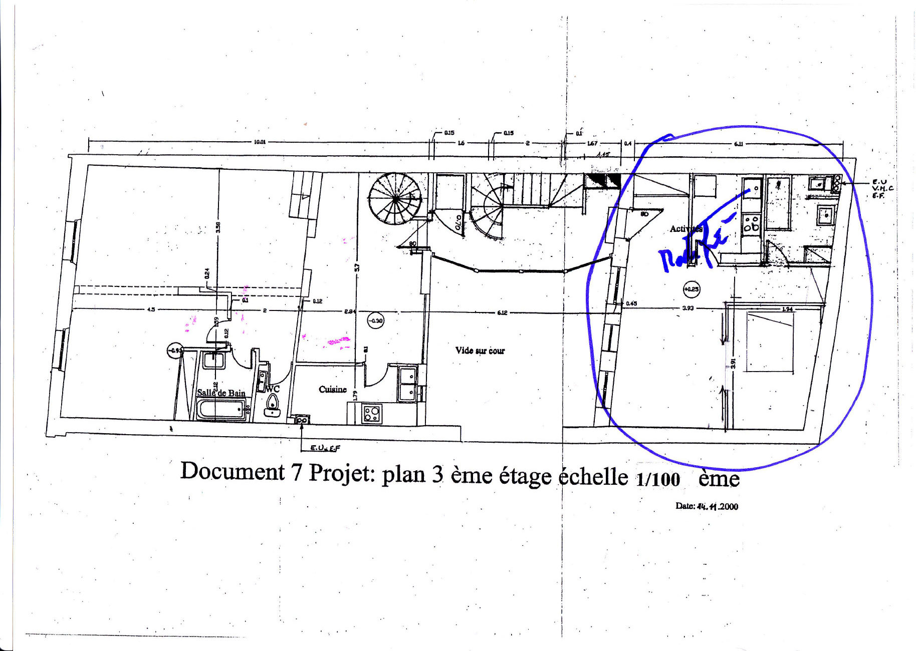 En prenant l’escalier hélicoïdal on arrive au 3éme avec la même entrée avec porte palière qui distribue à gauche une chambre sur cour avec sa douche et WC et en avant sur rue une salle à manger avec cuisine avec fenêtre ouverte sur cet espace qui forme un tout. D’où une cuisine non confinée bien que de taille réduite mais très fonctionnelle. Une circulation  amène à une chambre séparable par porte coulissante ,une salle de bains et des toilettes séparées.