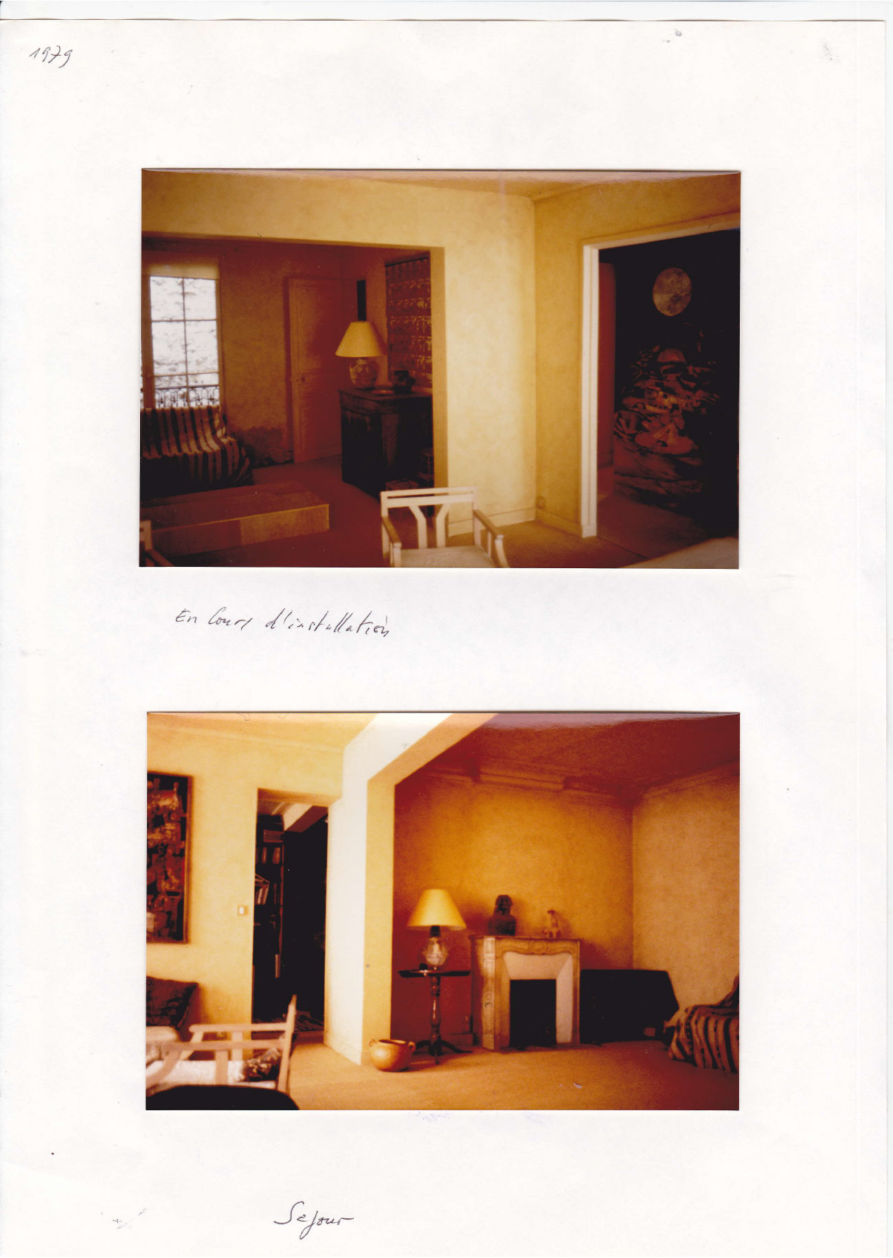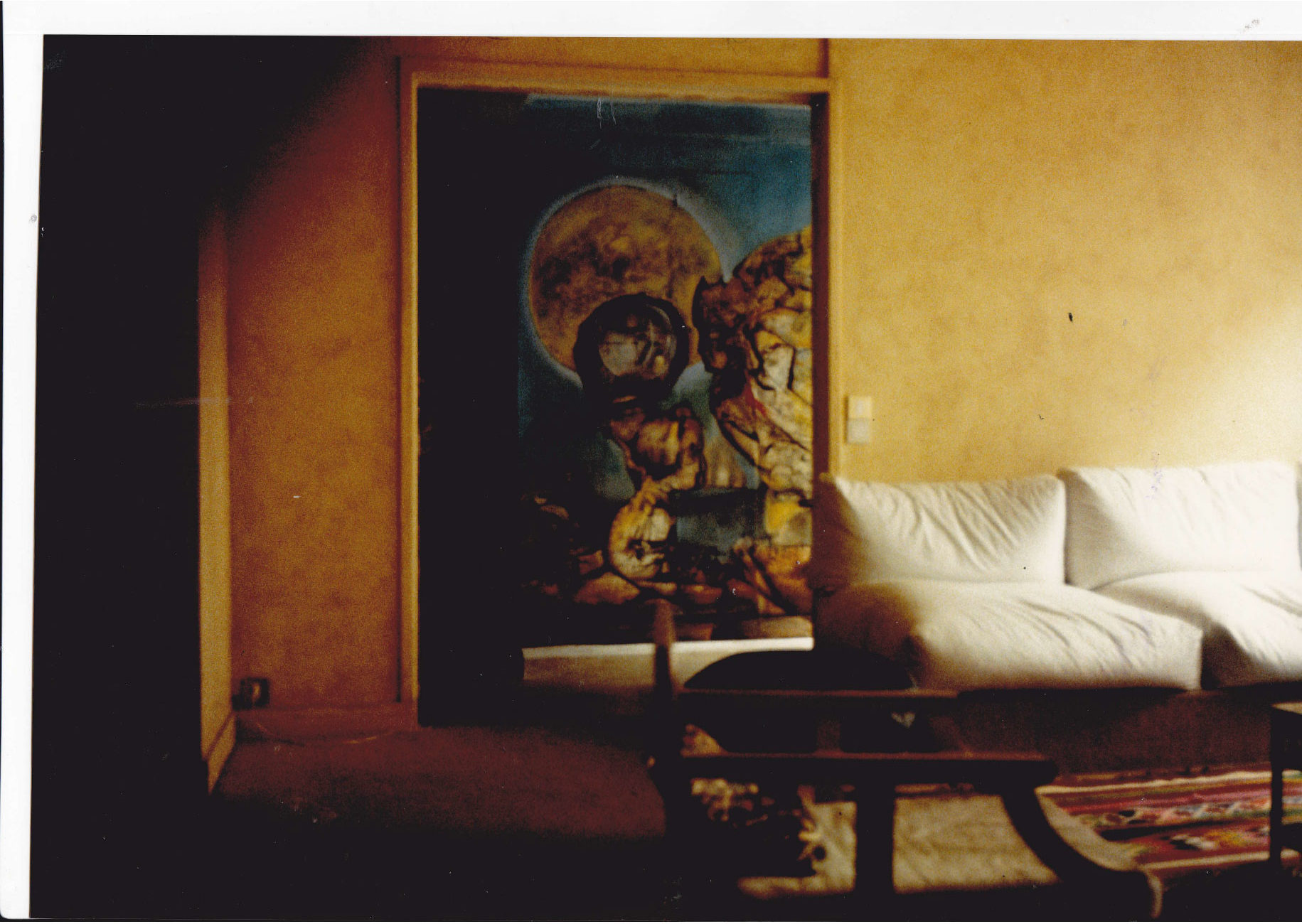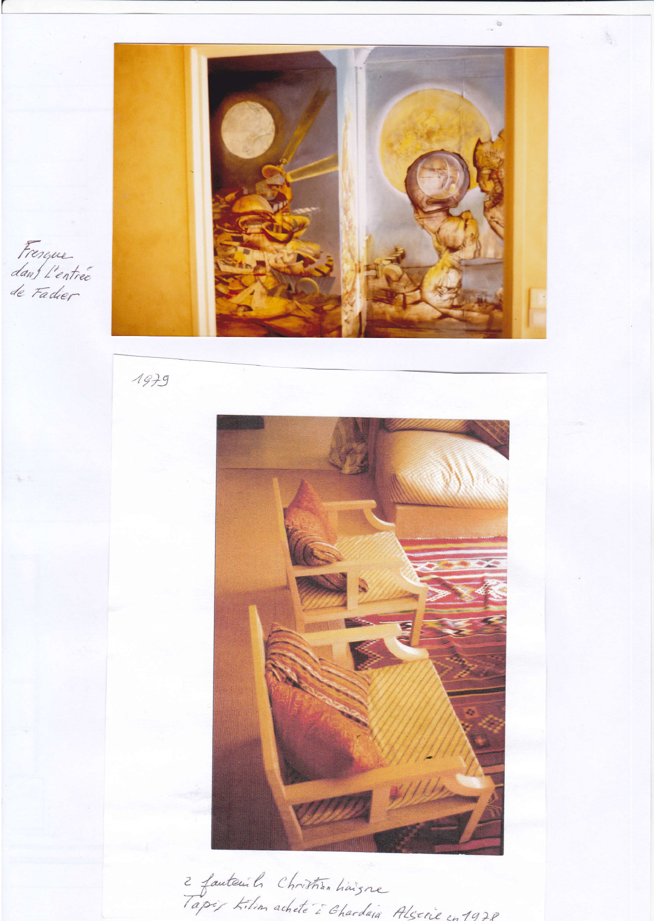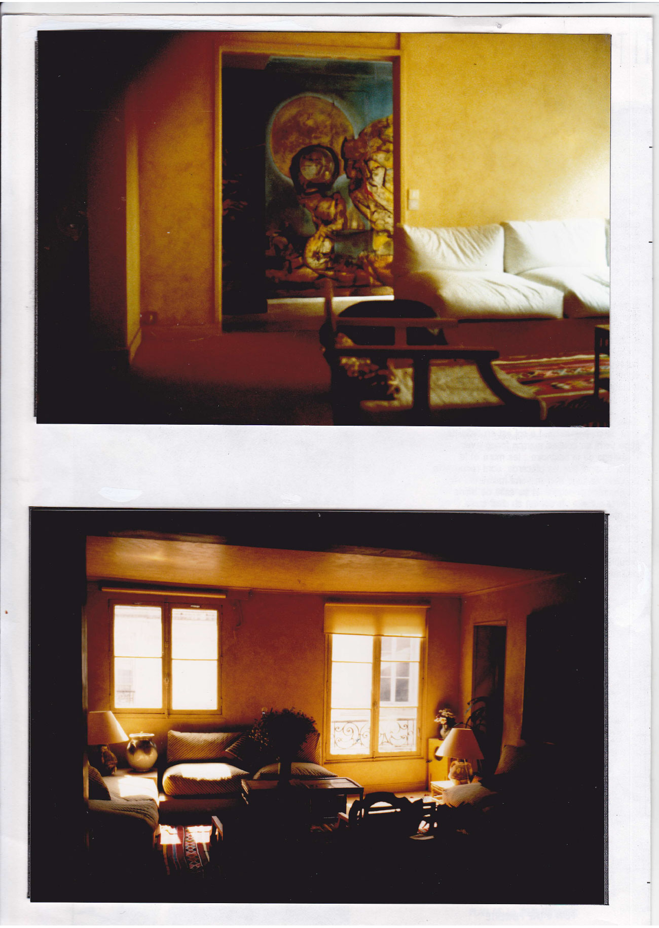 J’ai fait appel à un ami peintre Fadier pour me concevoir une grande fresque sur le mur de l’entrée qui fait disparaitre la double porte palière et face à elle, un miroir sur tout le mur. Son thème, à ma demande, fut orienté sur le soleil et sa lumière, son énergie .