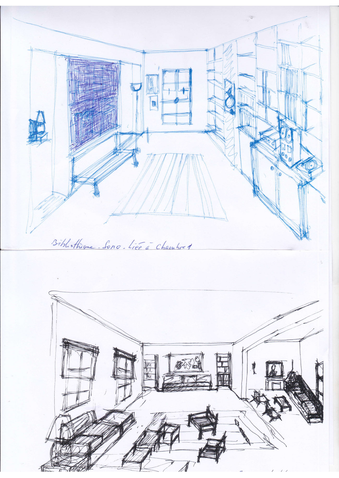 Le dossier comporte des planches de plans et photos et des croquis d’ambiance de certaines parties de l’appartement.