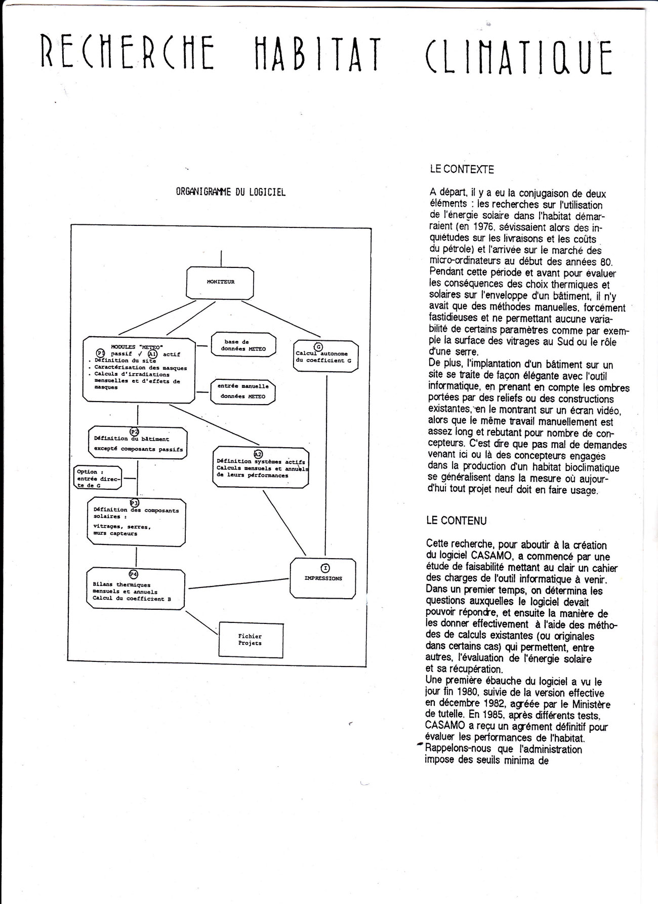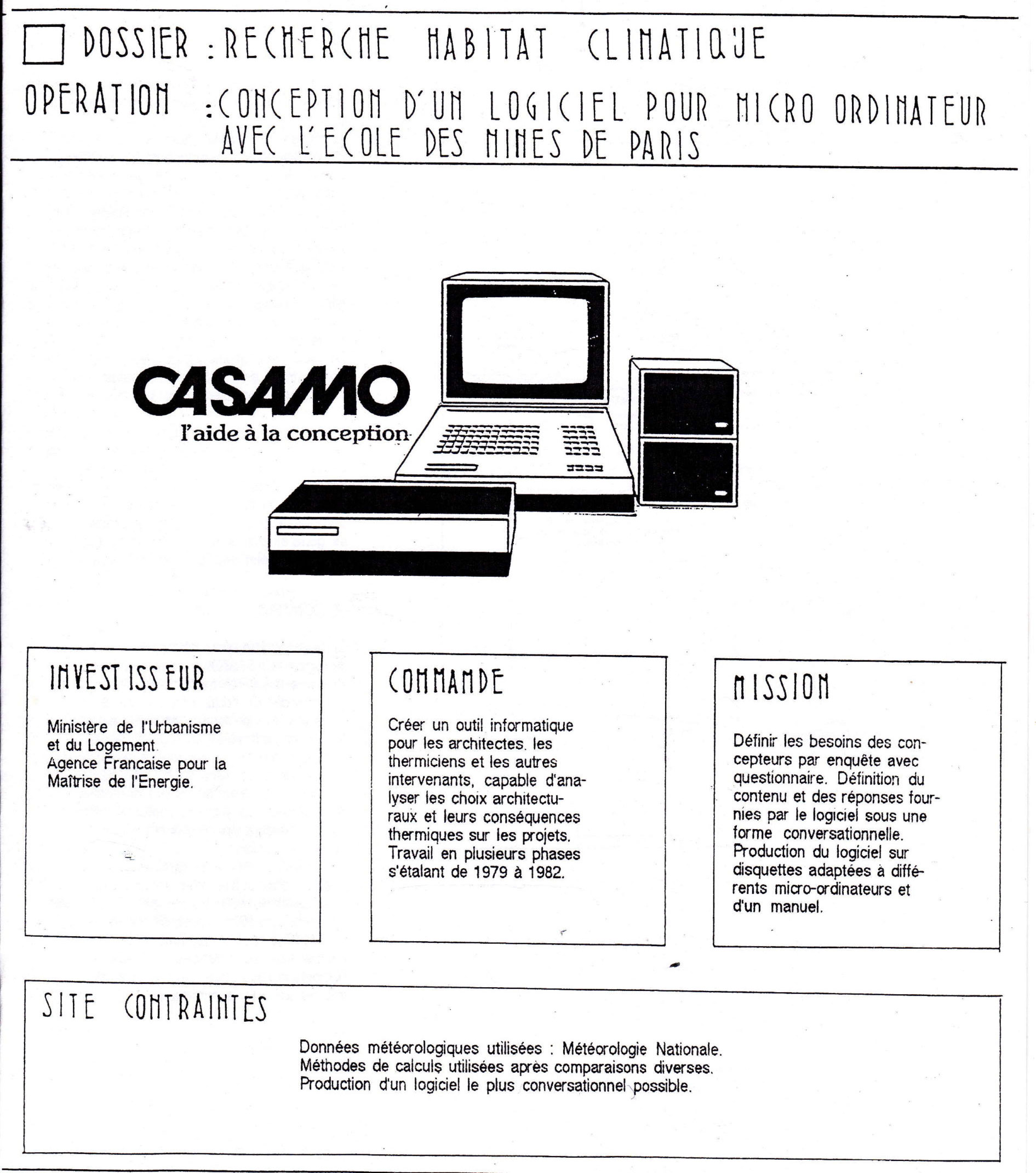 C’est un outil de conception lié au développement de la micro informatique (qui existe déjà en 1978)en direction des architectes et des thermiciens dans l’objectif de mieux concevoir les bâtiments en prenant en compte le climat d’un lieu à travers le soleil, le vent, la température, le lieu d’implantation pour fournir des résultats sur les bilans thermiques qui permettent de choisir des organisations spatiales ,des systèmes de production de chaleur ,d’étudier les performances de systèmes solaires pour produire de la chaleur lié à un système de chauffage et pour la production d’eau chaude sanitaire .