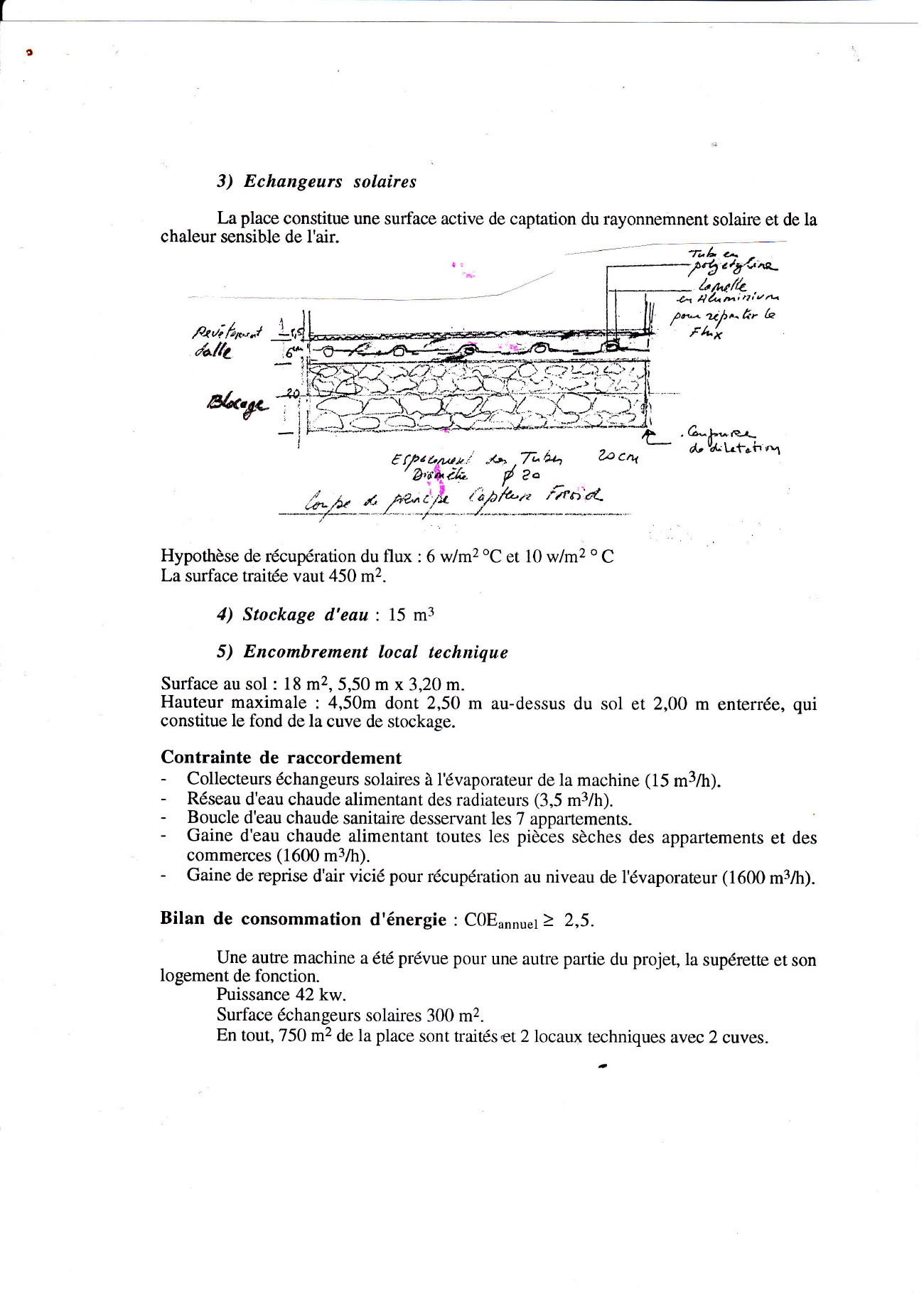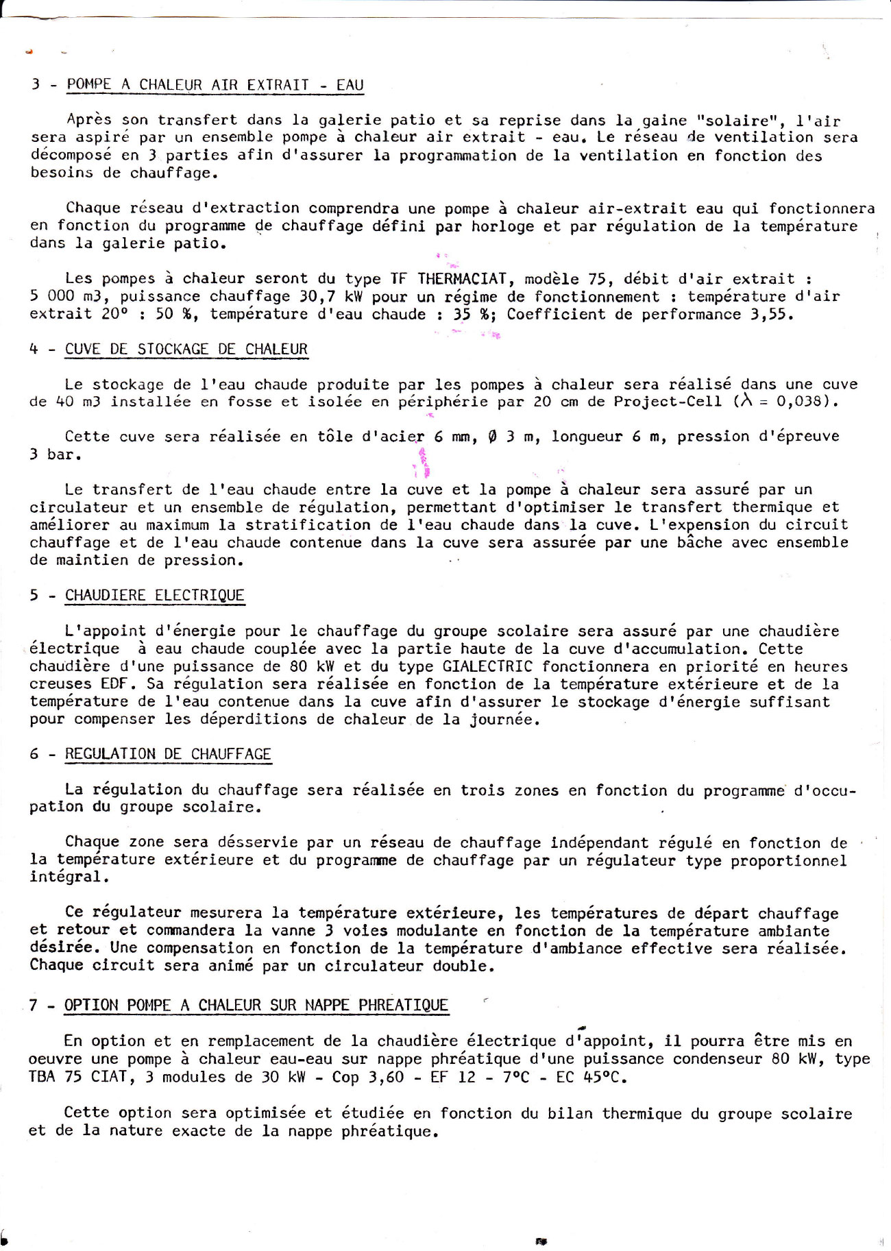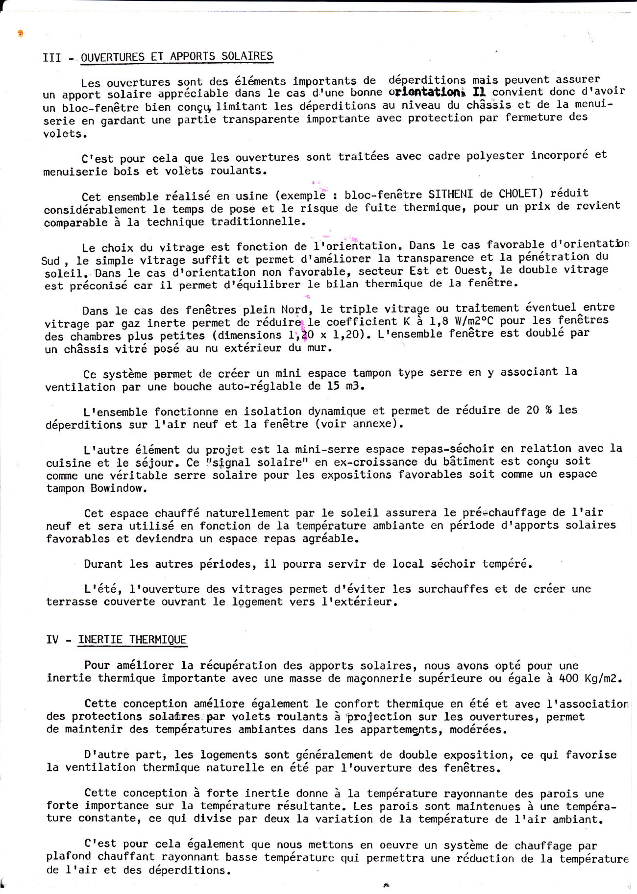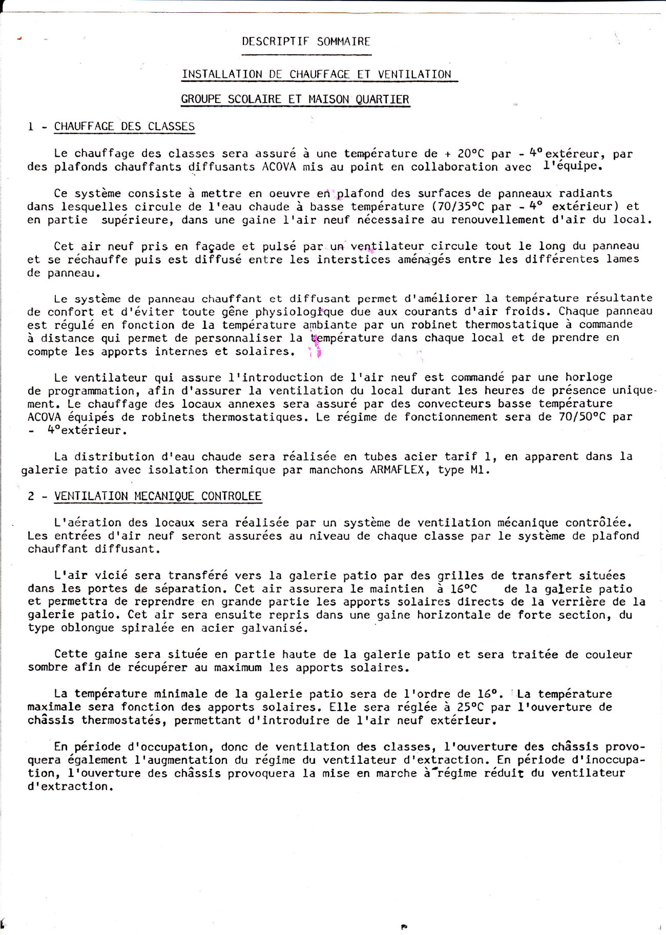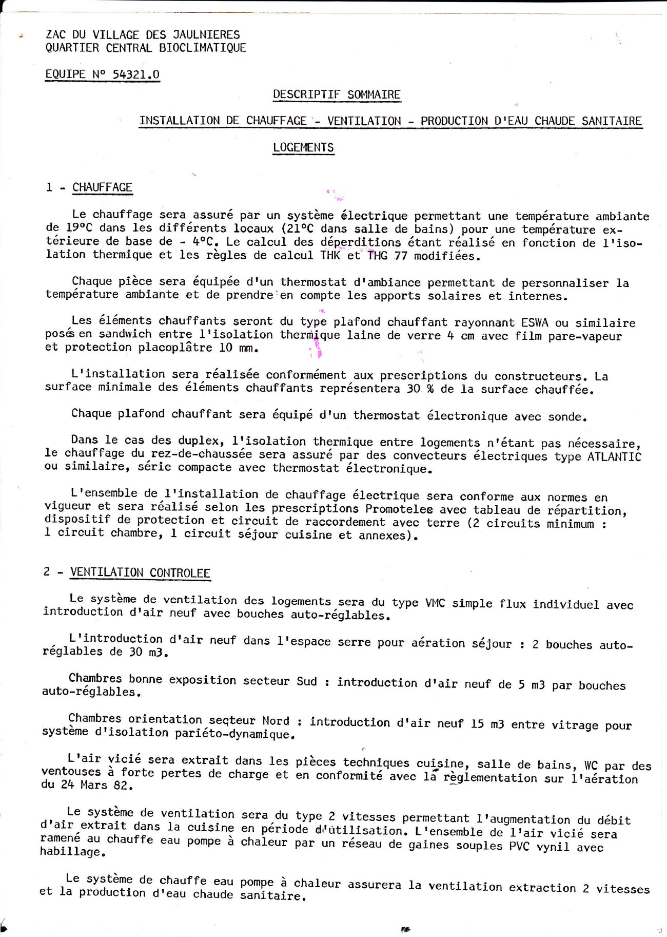 Les documents présentés sont issus de mes archives .Ils montrent a l’aide des plans du projet la réponse apportée qui a été très différente selon les 2 îlots de logements, l’école et la maison de quartier. La lecture des documents me rappela que sur les Logements il était demande par exemple de prévoir le vol de Chaleur entre les appartements mitoyens contigus et superposes il y a prés de 40 ans .