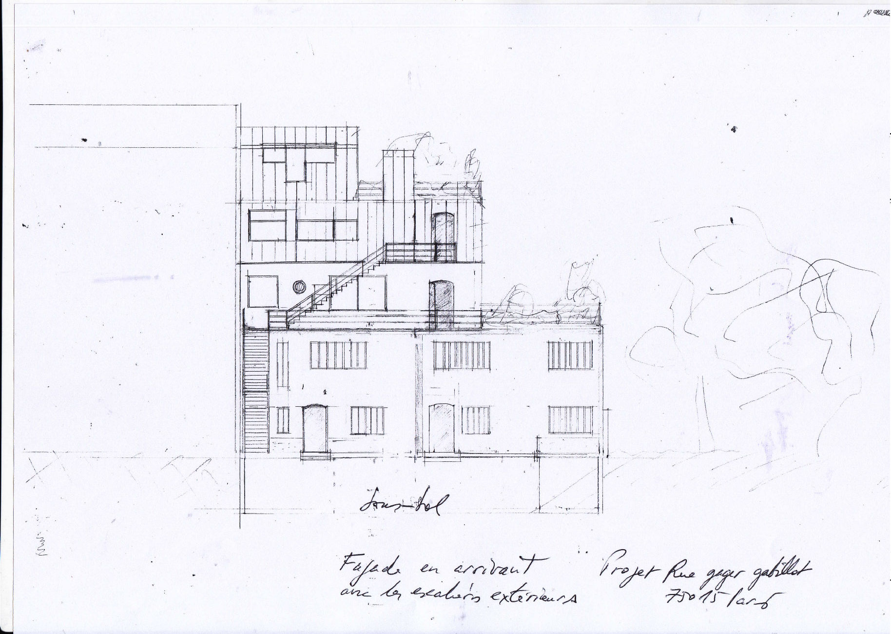 Le projet a des parkings en sous-sol ,2 duplex en rez de chaussée et 1er étage qui donne sur jardin et cour d’arrivée, un appartement au 2éme étage avec terrasse et un duplex aux 3/4éme étages avec terrasse.