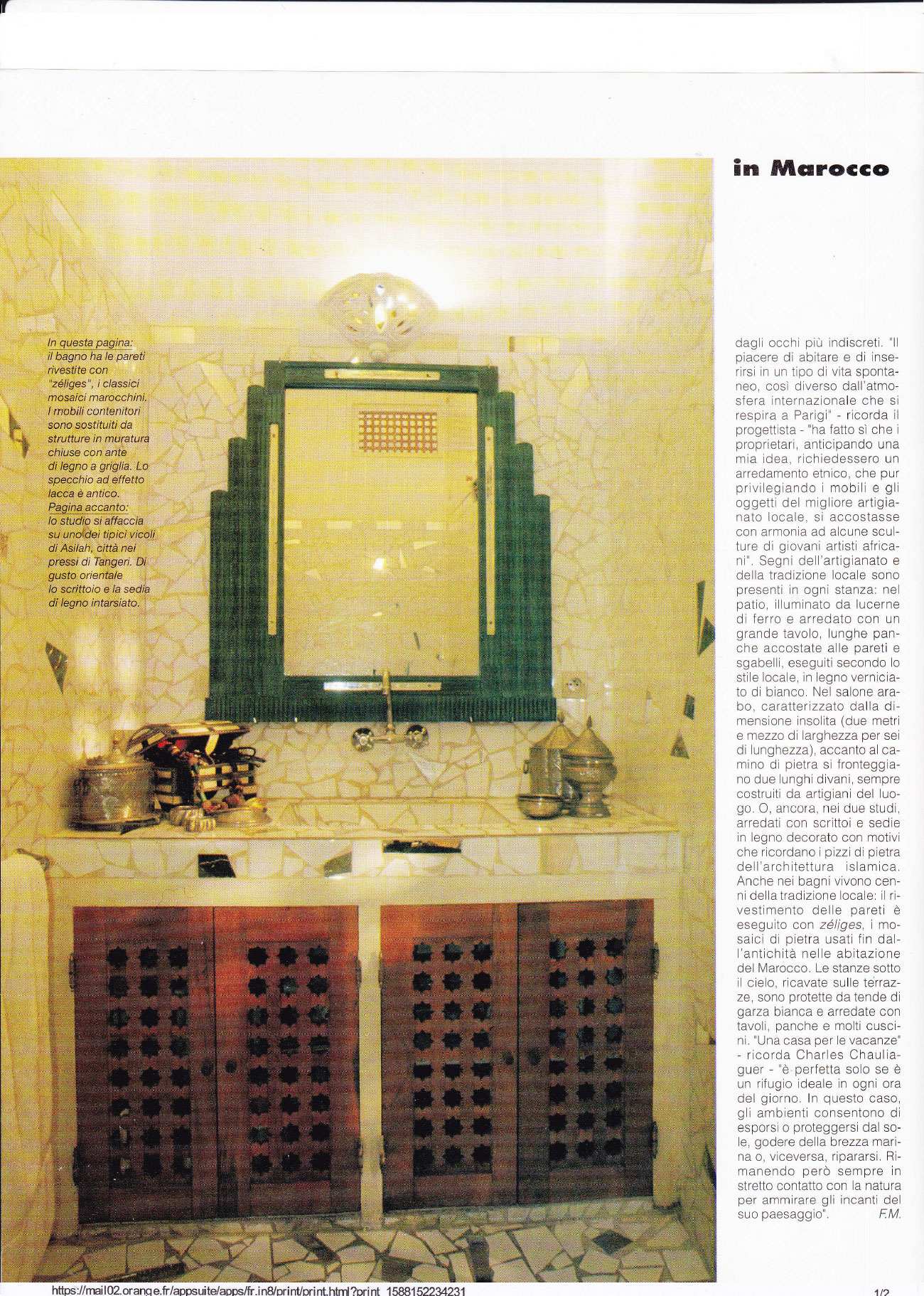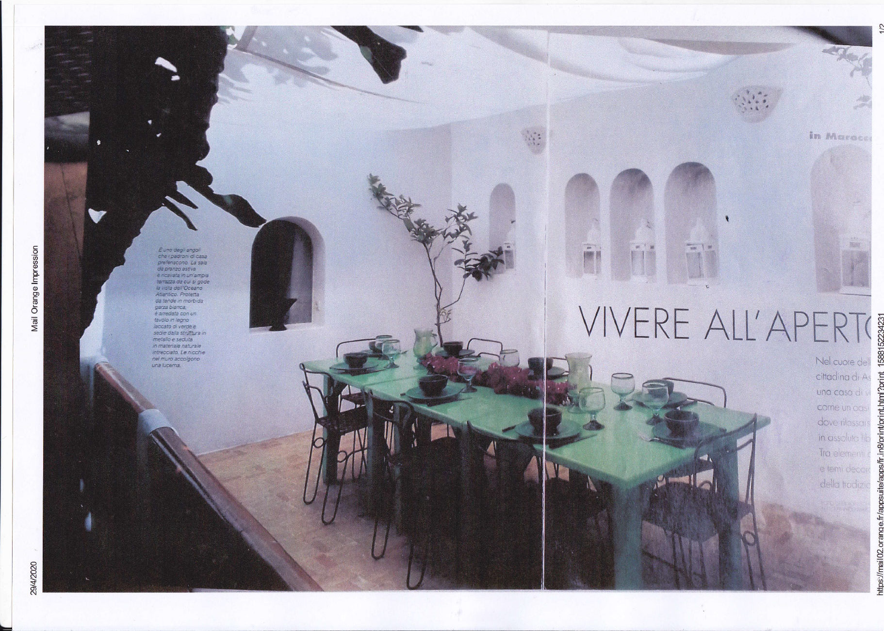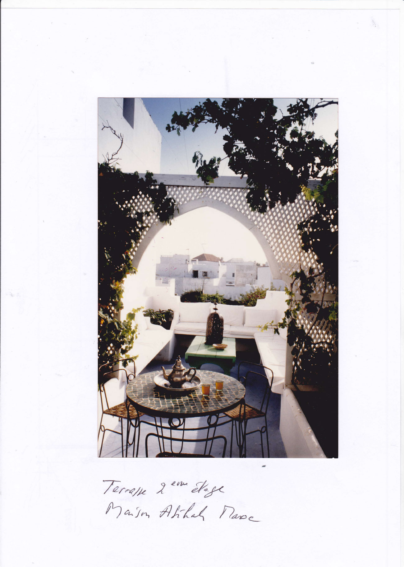 Mon ami propriétaire de la maison s’est beaucoup impliqué dans des éléments décoratifs comme le choix du carrelage du sol de la cour /patio, des bejmats qui se fabriquent dans les fours de Meknès. Beaucoup de lieux du Maroc de l’époque ancienne les ont utilisés ; les lanternes, les tapis, du mobilier chiné ont été chinés à Tanger; du mobilier a été fabriqué par un menuisier local.