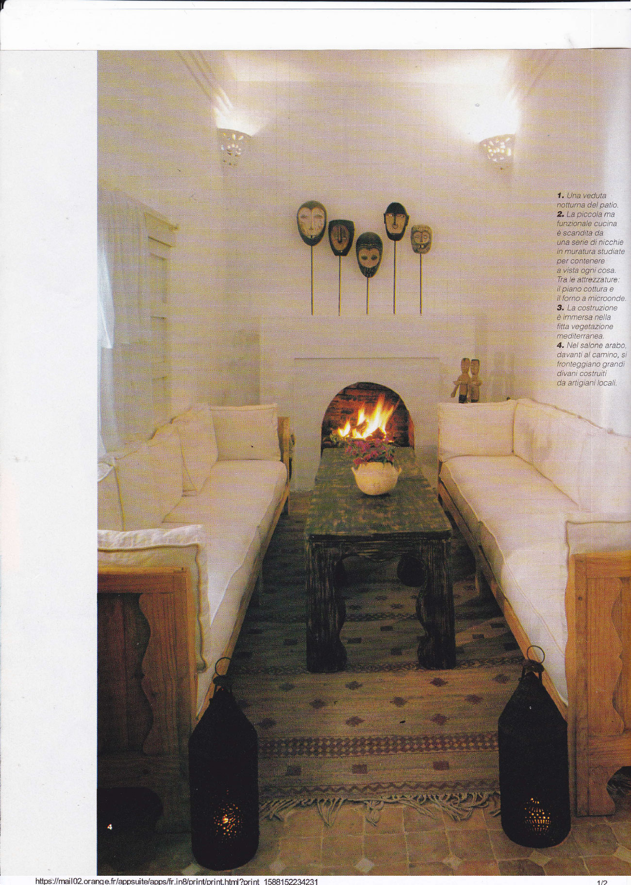 Le salon avec la cheminée est une pièce aux dimensions usuelles au Maroc dans la maison de médina; grande longueur 7.00m et assez étroite en largeur 2.20 à 2.50m, une hauteur sous plafond de 3.20m ou plus avec à la liaison plafond/mur des moulures très simples .L’enduit des murs est avec de la chaux. Celle-ci permet de colorer très facilement avec des pigments pour recouvrir couche par couche à la brosse.