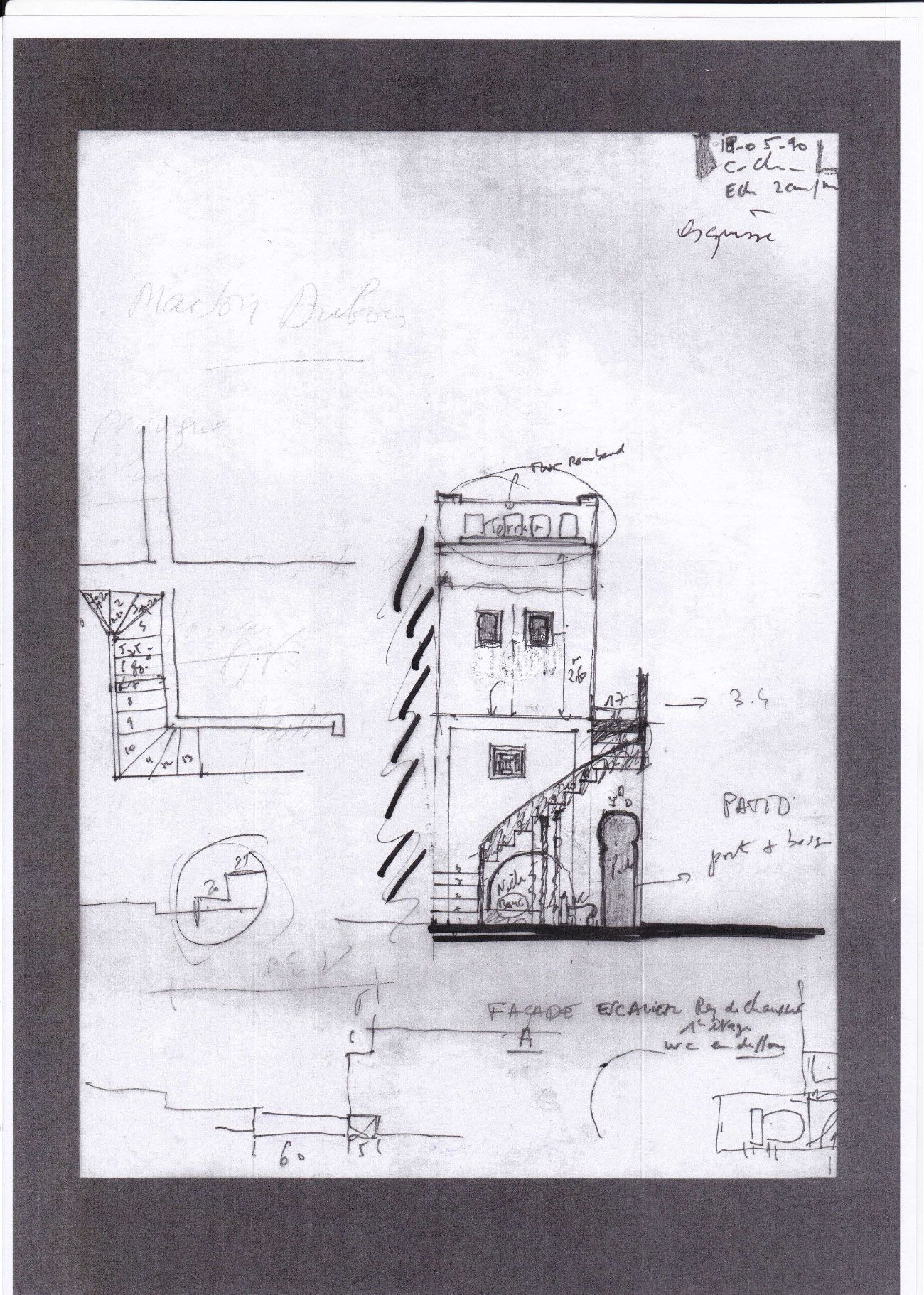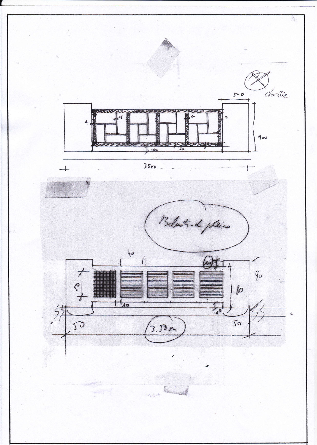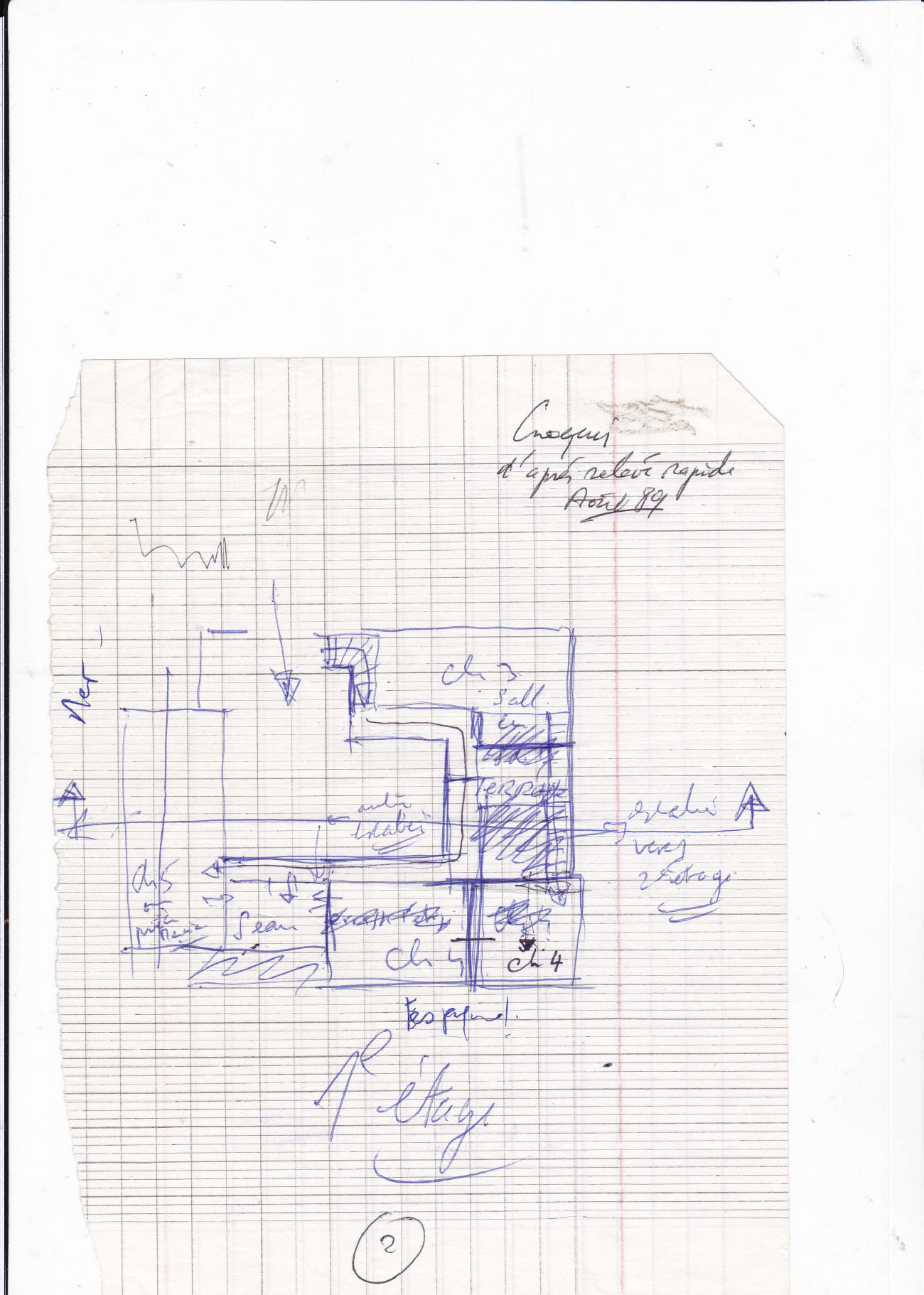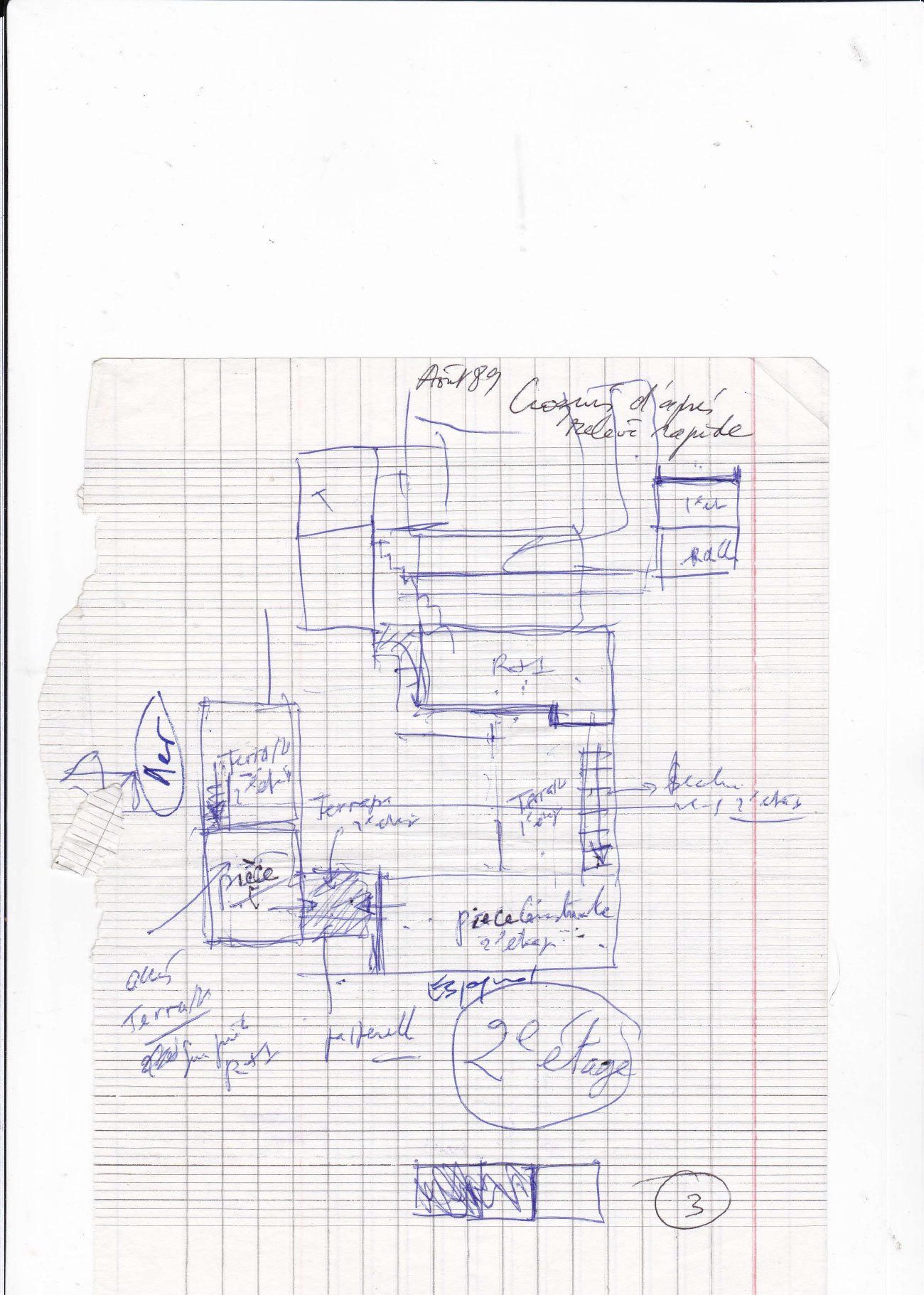 Le dossier présente des photos issus d’un article d’un journal de décoration, des plans des niveaux pour comprendre l’organisation spatiale, les dessins des façades, des balustrades en bois ainsi que 3 feuilles d’un cahier d’écolier où s’exprime les mesures relevées avec l’essai pour tester le futur projet.