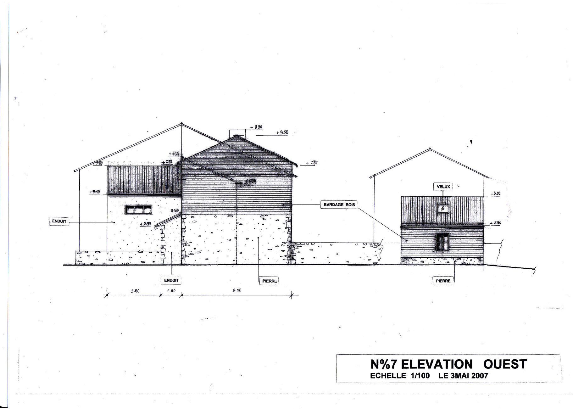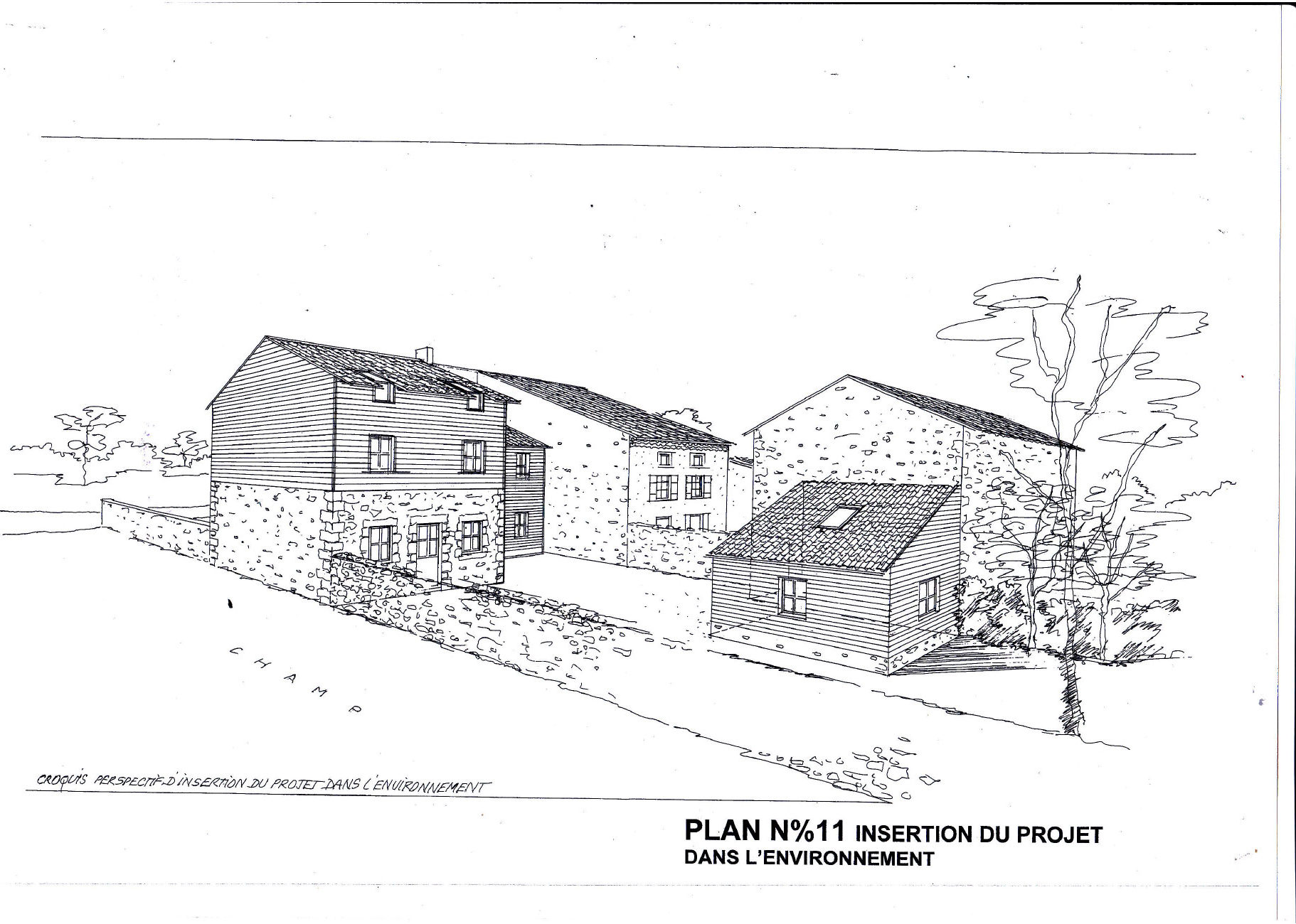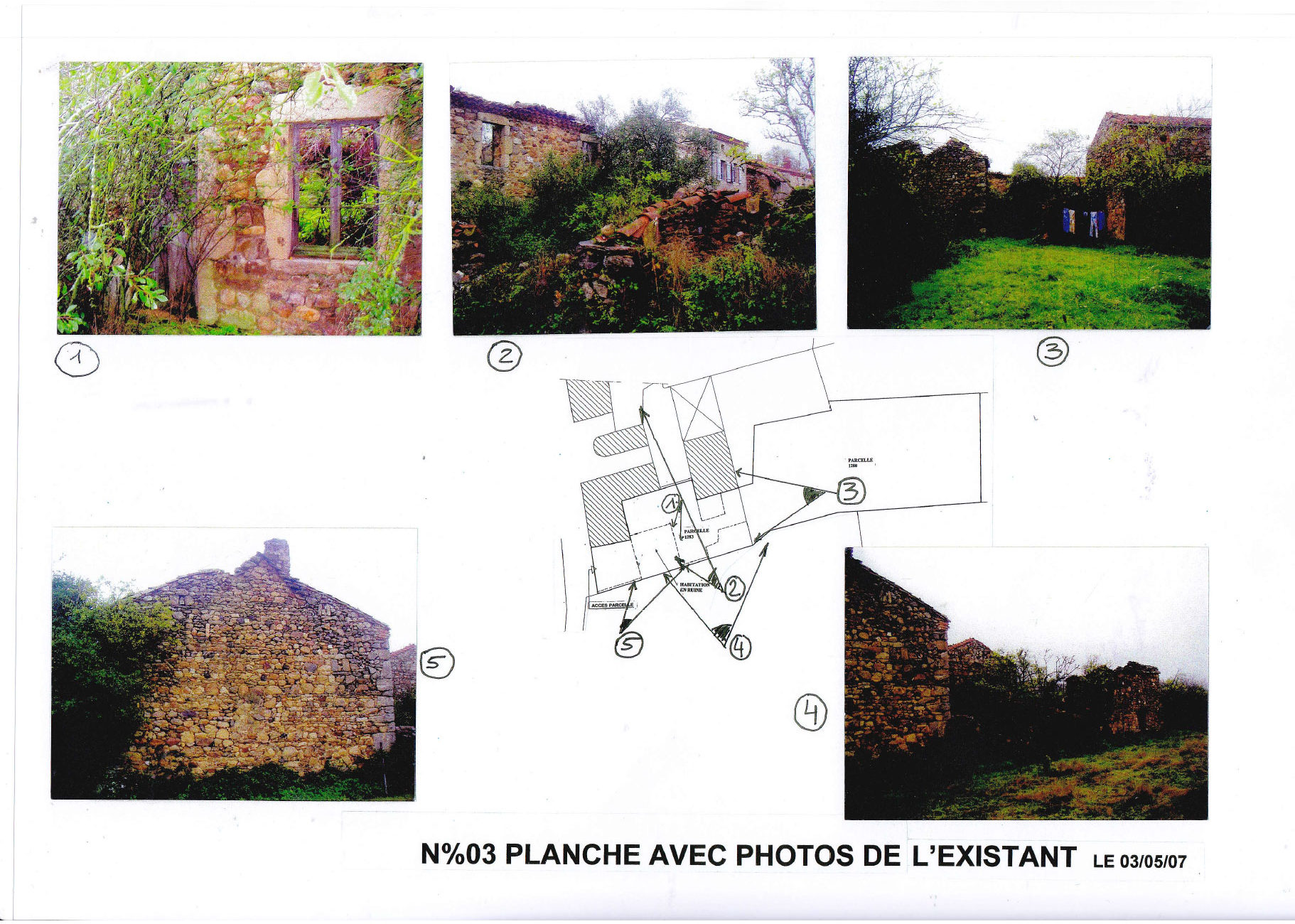 Le dossier montre quelques photos du lieu en état de ruine et le projet dessiné .Au premier étage une ossature bois a été proposée avec revêtement extérieur en Mélèze. Le petit bâtiment annexe a été traité dans le même esprit. Le projet au rez de chaussée comporte: garage, séjour et cuisine, toilettes , un escalier mène au 1er étage pour distribuer 3 chambres et 2 salles de bains. Le petit bâtiment extérieur est un atelier/bureau.