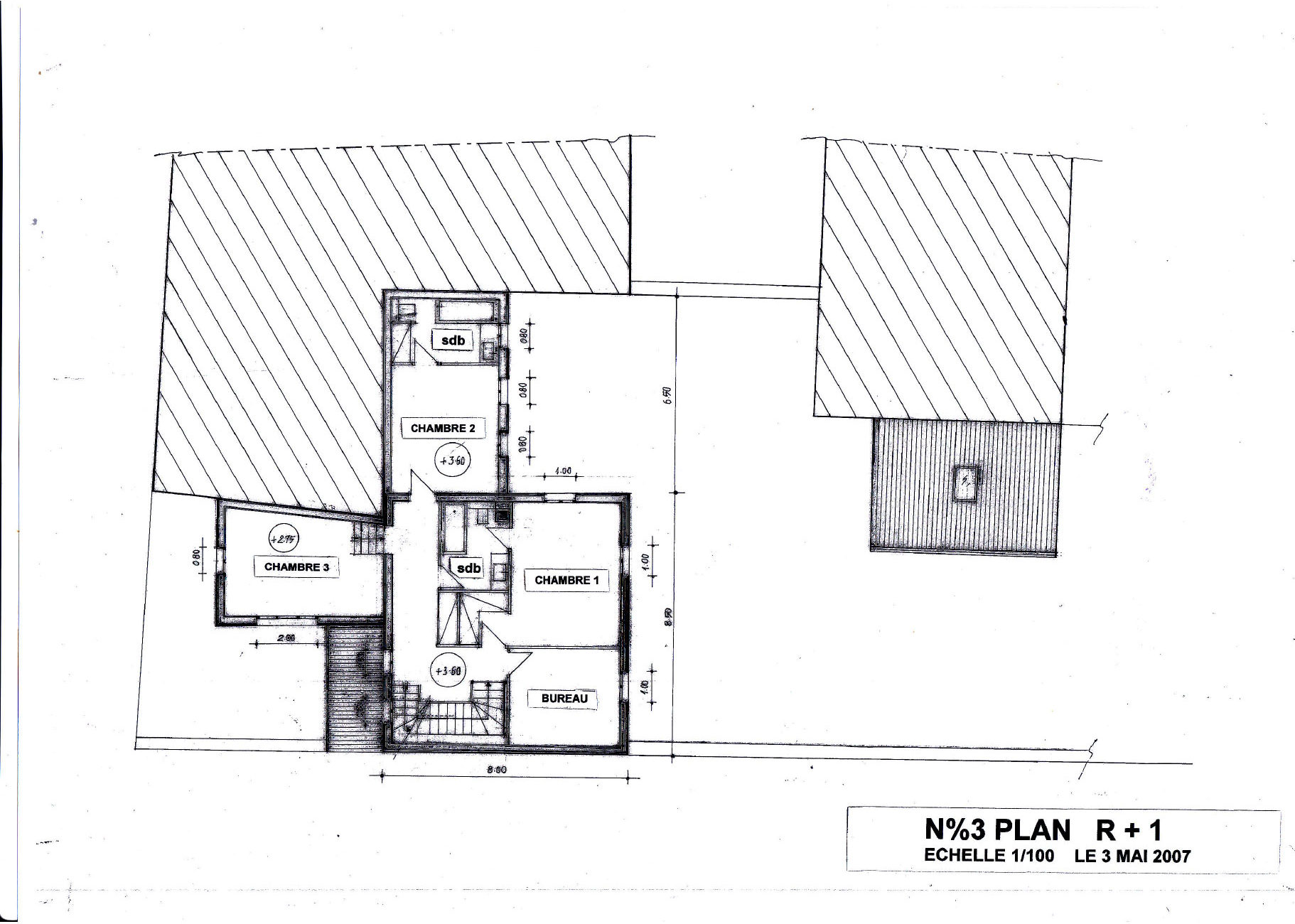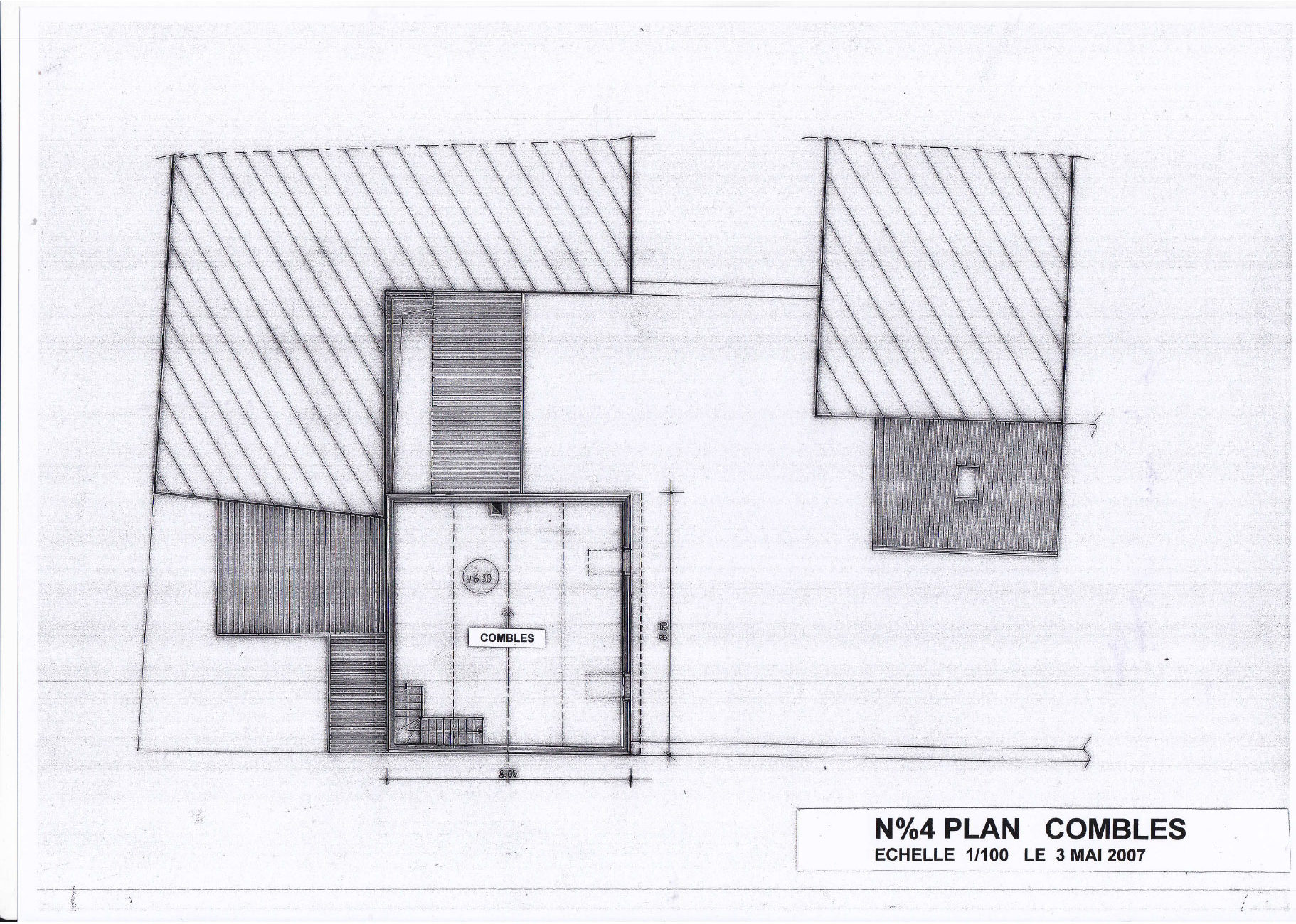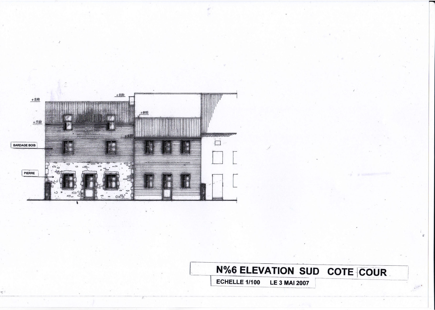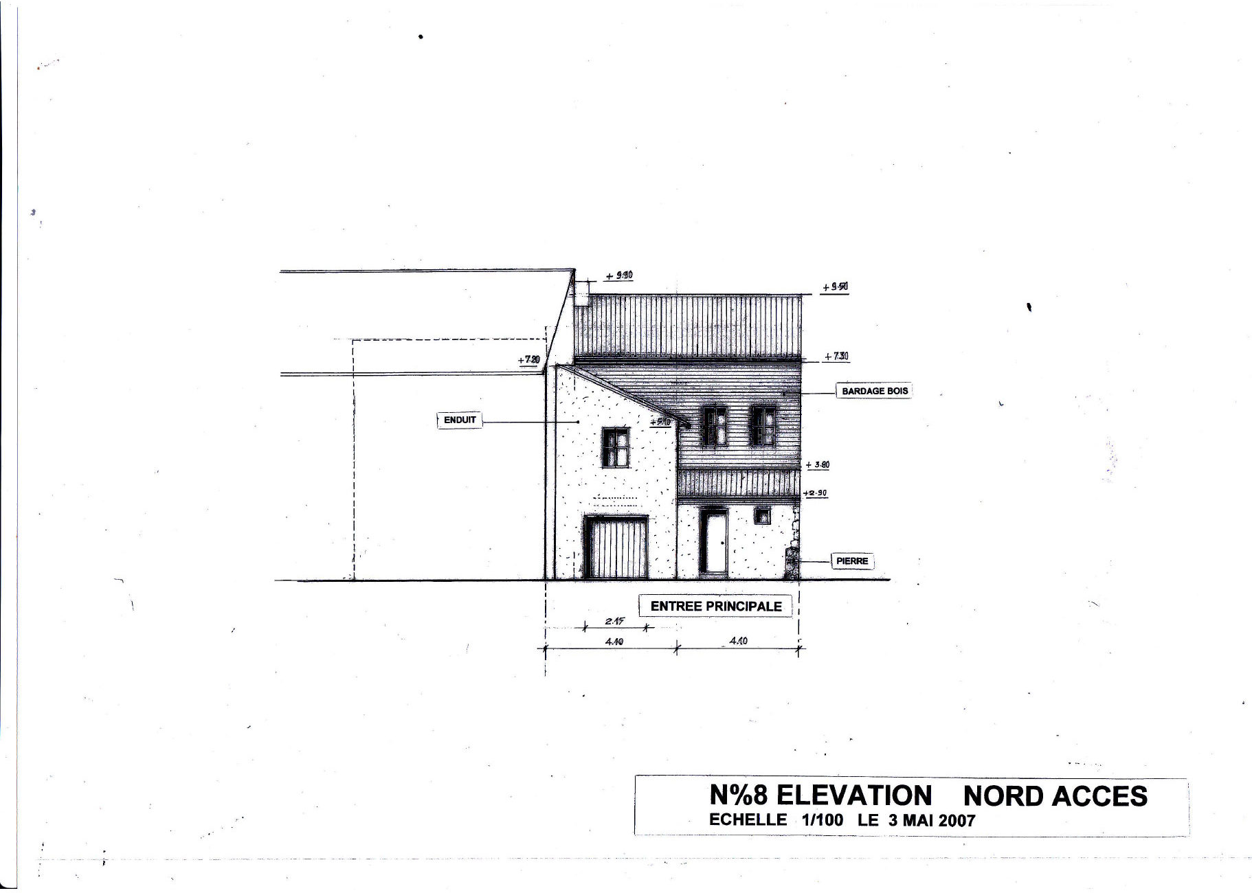 Le dossier montre quelques photos du lieu en état de ruine et le projet dessiné .Au premier étage une ossature bois a été proposée avec revêtement extérieur en Mélèze. Le petit bâtiment annexe a été traité dans le même esprit. Le projet au rez de chaussée comporte: garage, séjour et cuisine, toilettes , un escalier mène au 1er étage pour distribuer 3 chambres et 2 salles de bains. Le petit bâtiment extérieur est un atelier/bureau.