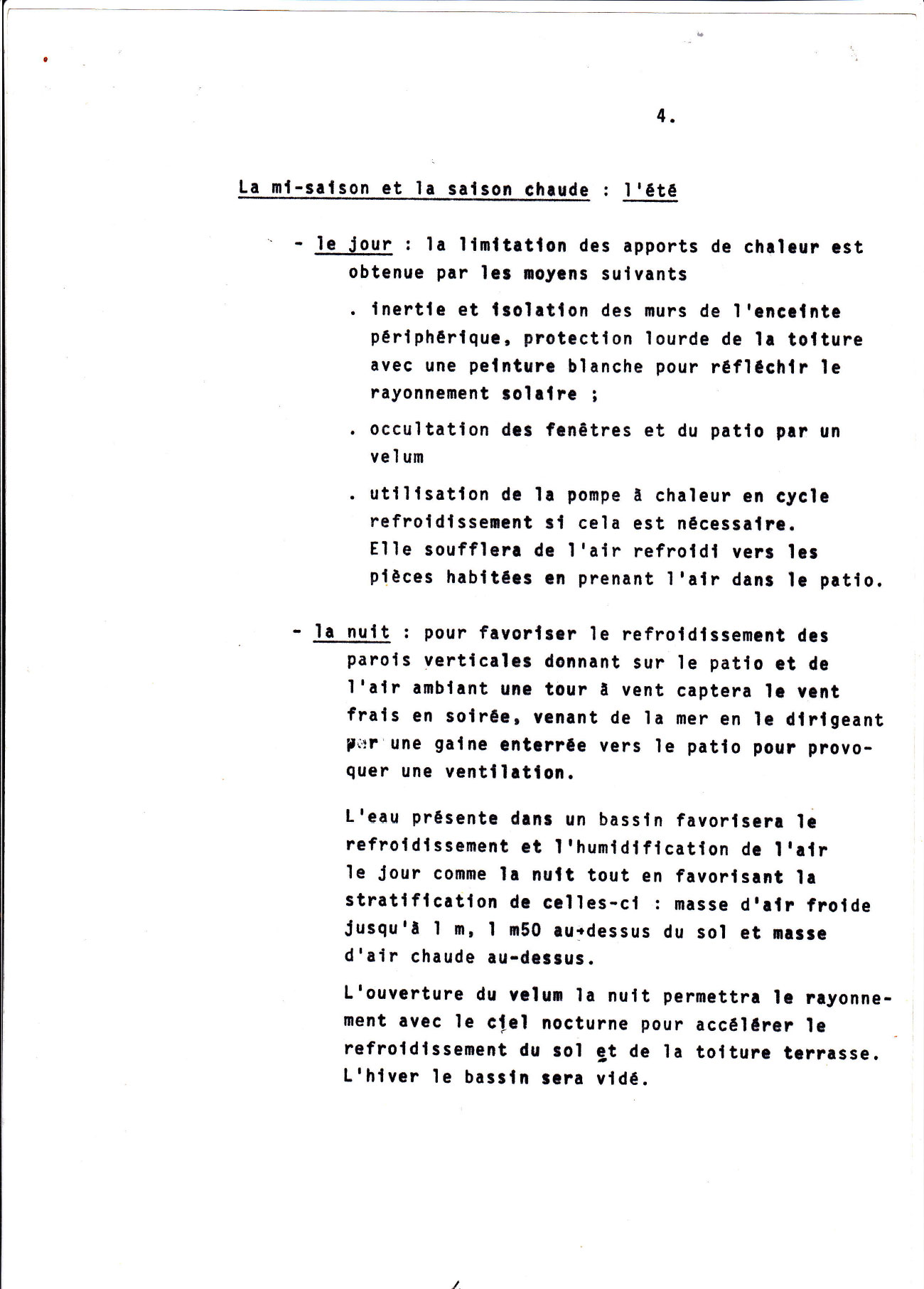 En été, une double toiture, un velum au-dessus du patio, une inertie lourde de l’enveloppe (400 kg/m2) issue des études de conception avec en plus, une tour à vent pour récupérer la brise du soir qui vient de la mer proche (suite à l’étude de la rose des vents locale) assortie à un bassin et à la végétation du patio pour humidifier l’air, permet de limiter les contraintes thermiques. La pompe à chaleur en cycle inverse complète le refroidissement et ramène la température des espaces fermés dans la zone de confort.