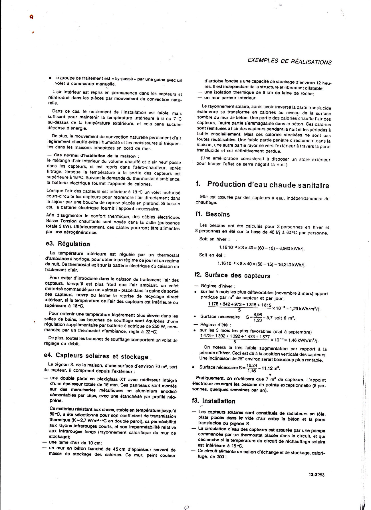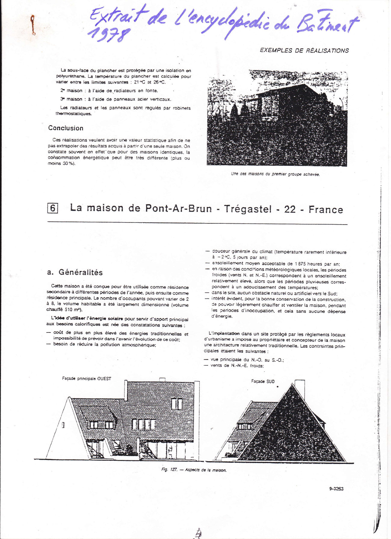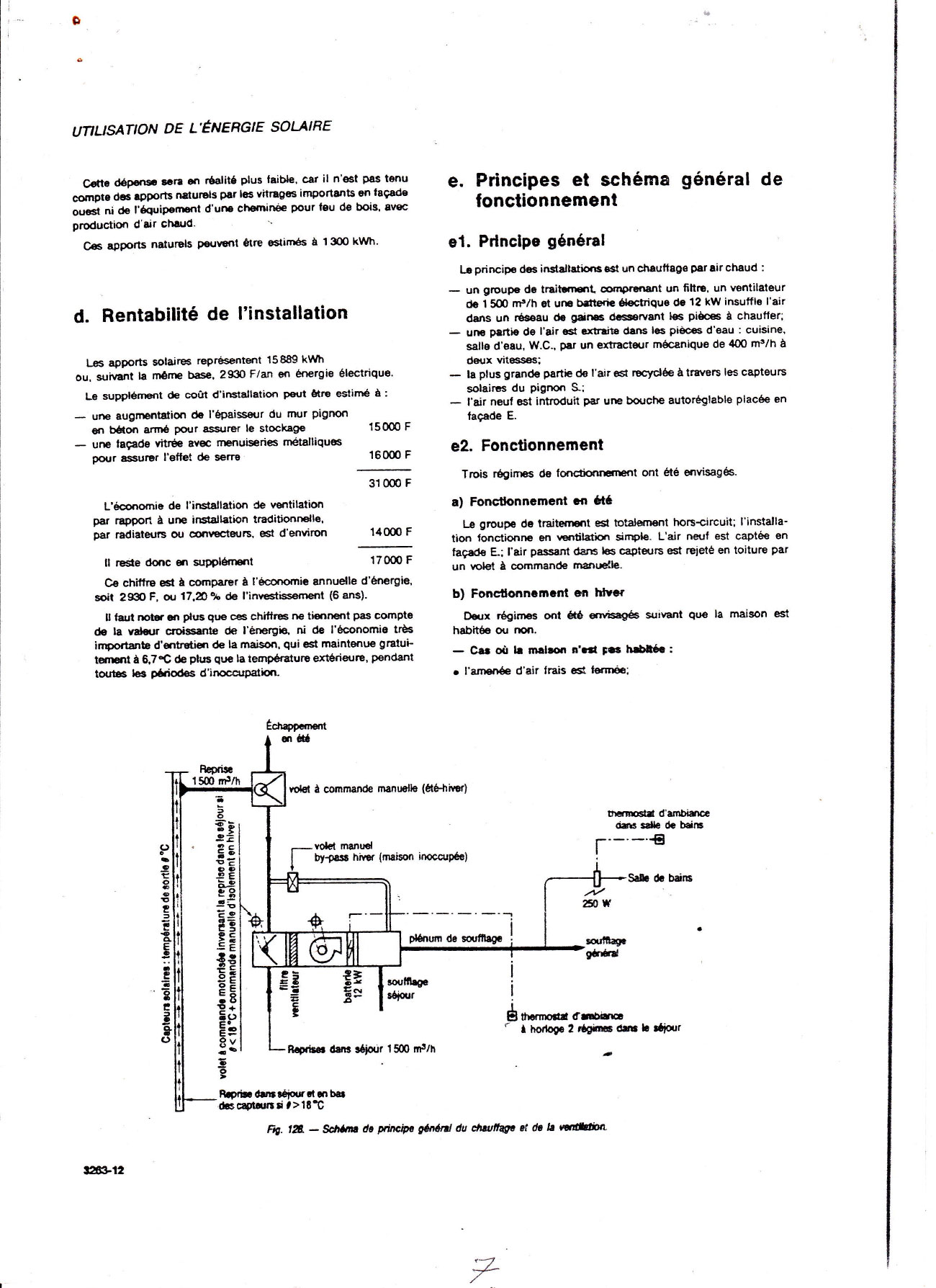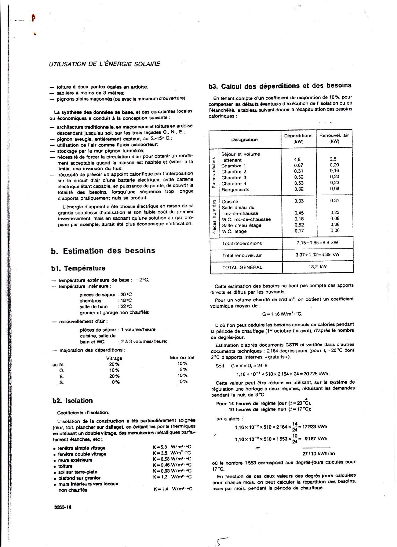 Elle a été conçue avec une isolation assez élevée pour l’époque. Les calculs donnèrent G = 1.16 W/m3 °C, pour un volume à chauffer de 510 m3. Les besoins de chauffage furent estimés sur la base des degrés jours des documents CSTB.