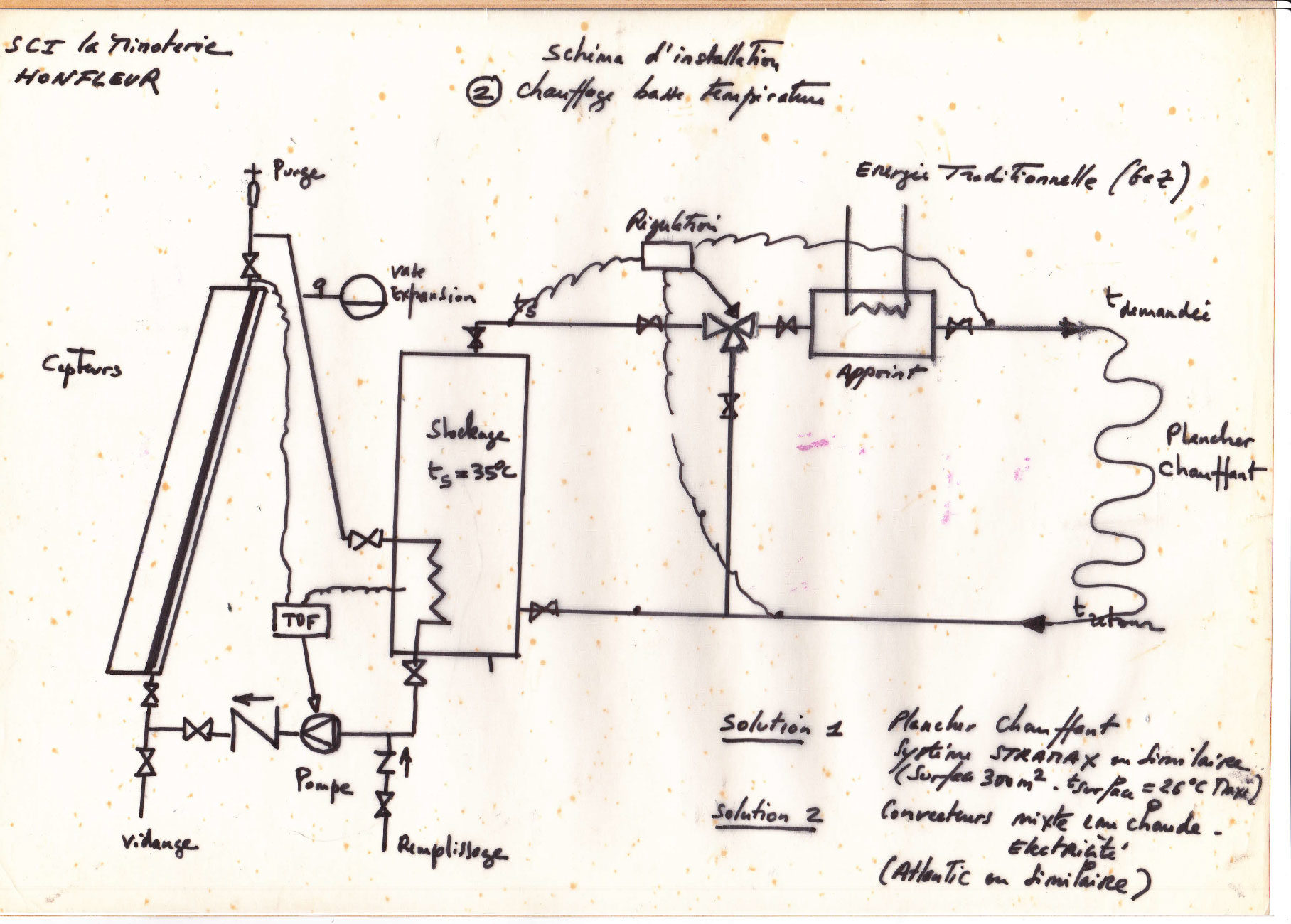 étudié pour un ancien étudiant où est montré la toiture entièrement couverte par des capteurs solaires avec 2 circuits: l’un pour le chauffage couplé à un chauffage au gaz et l’autre pour la production d’eau chaude sanitaire . Les schémas produits sont donnés.