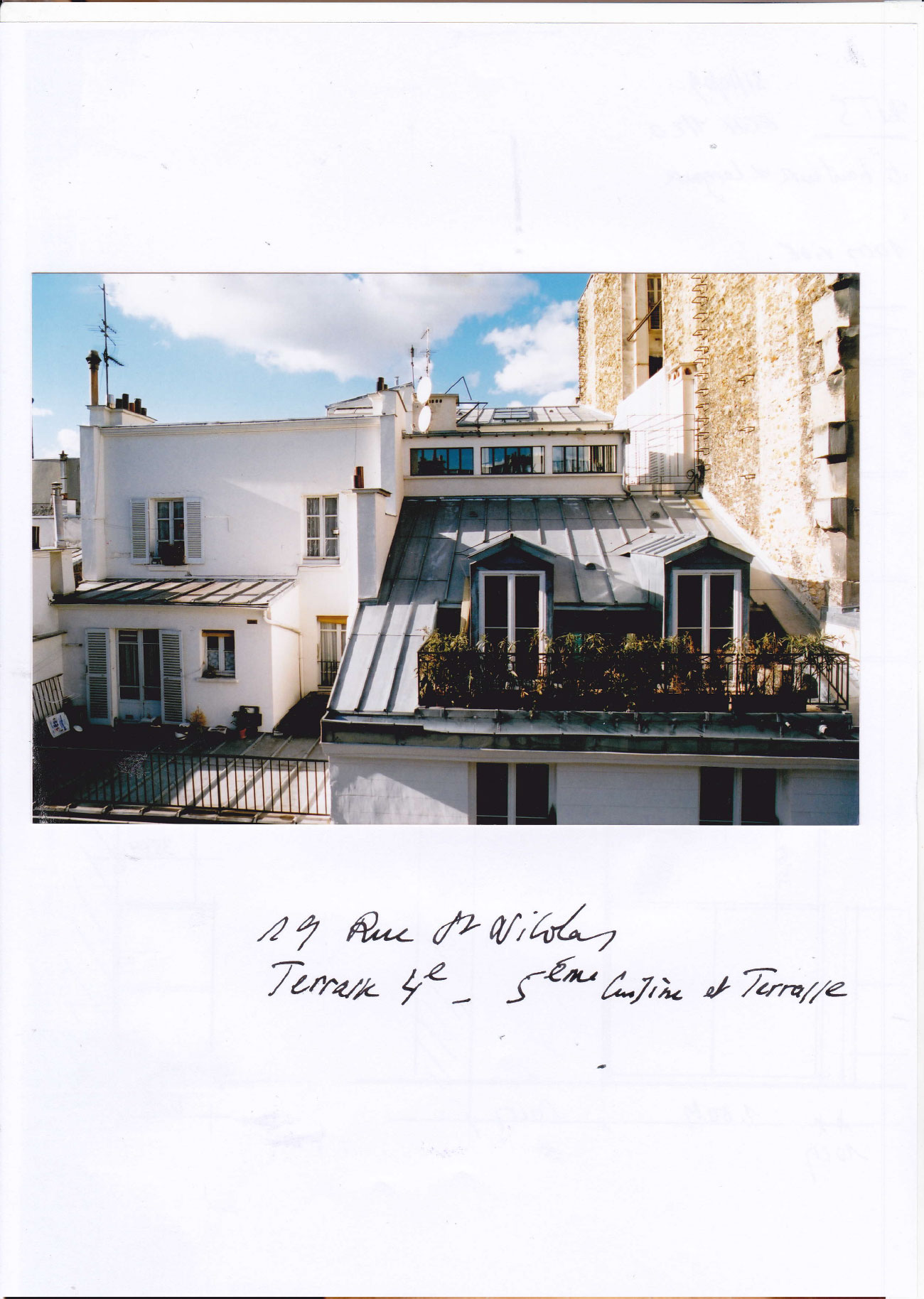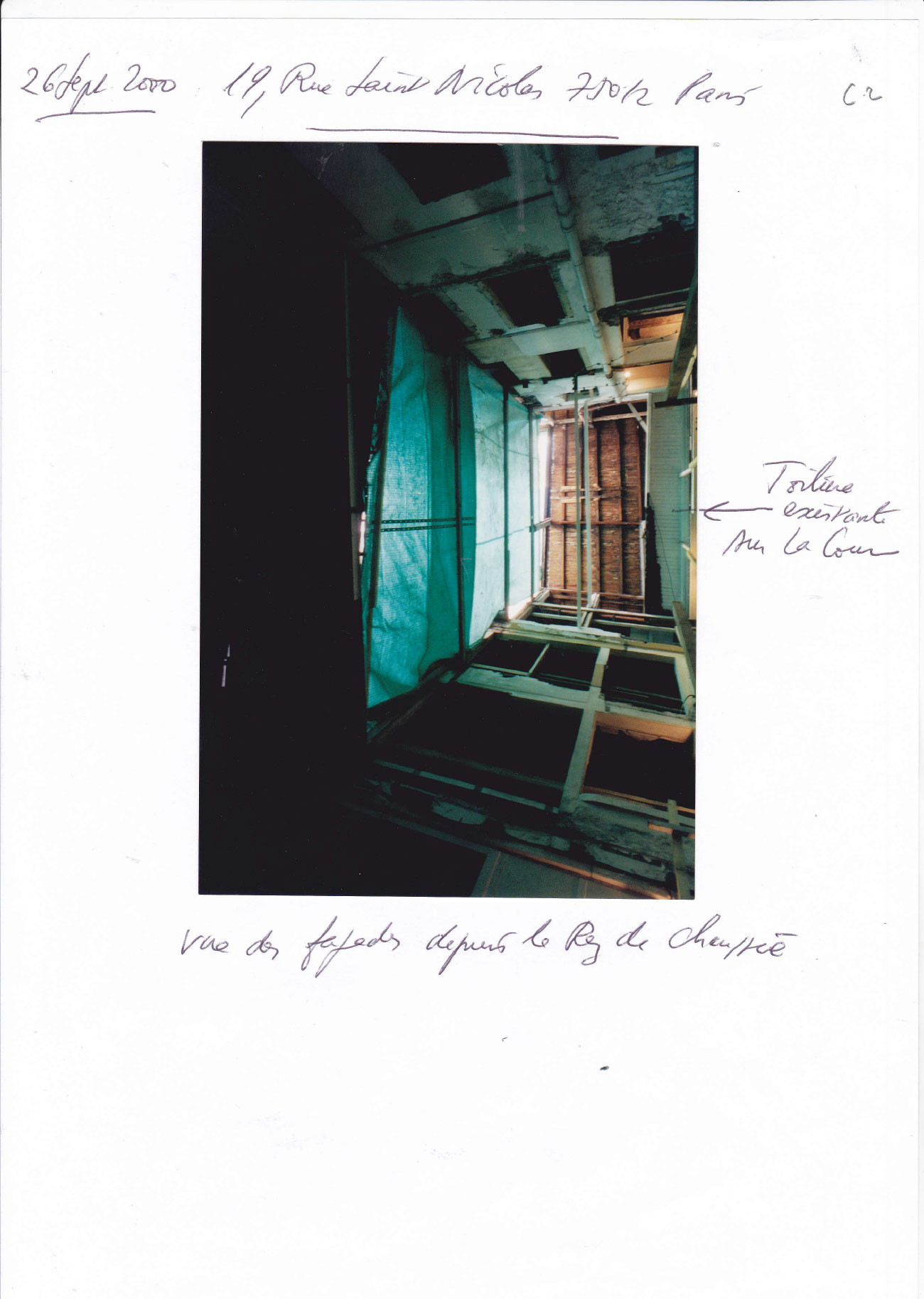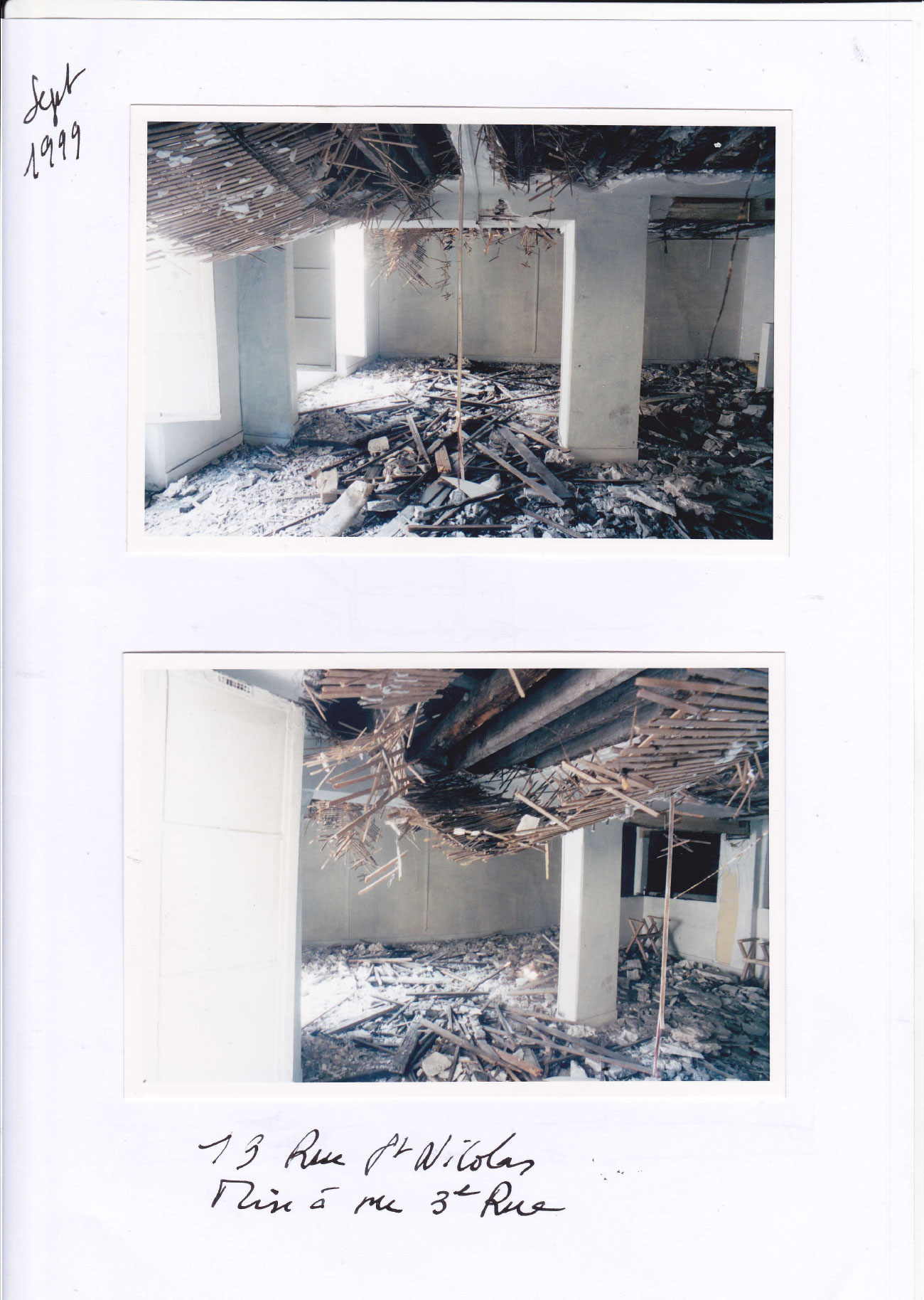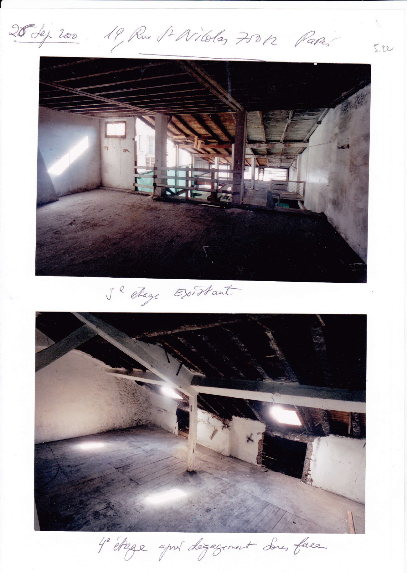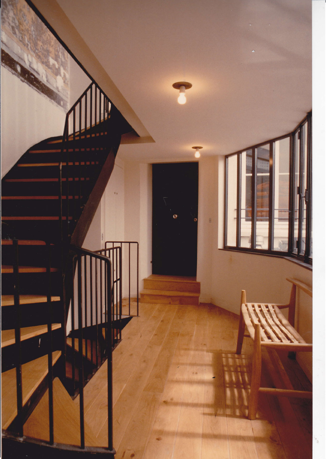 Des renforts métalliques par poutres ont eu lieu sur le bâtiment cour et reconstruction complète de la façade sur cour du bâtiment rue puis reconstruction de la charpente et couverture du 4éme étage sur rue avec création d’une terrasse et fenêtres pour la lumière puis du 5éme étage sur cour avec une mezzanine et reconstruction de la partie sur rue avec une petite terrasse et couverture nouvelle en zinc et châssis vitrés pour la lumière.