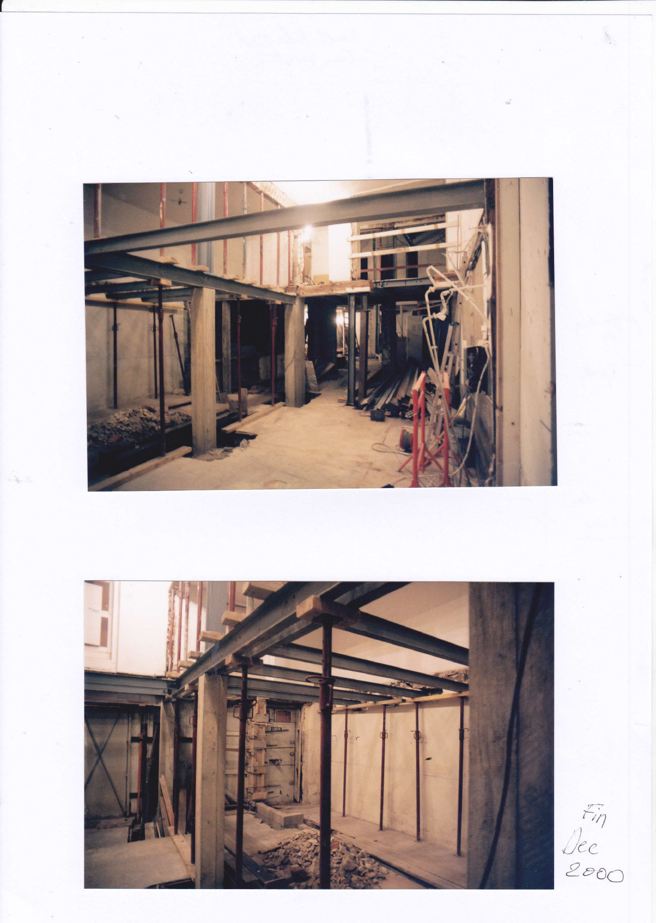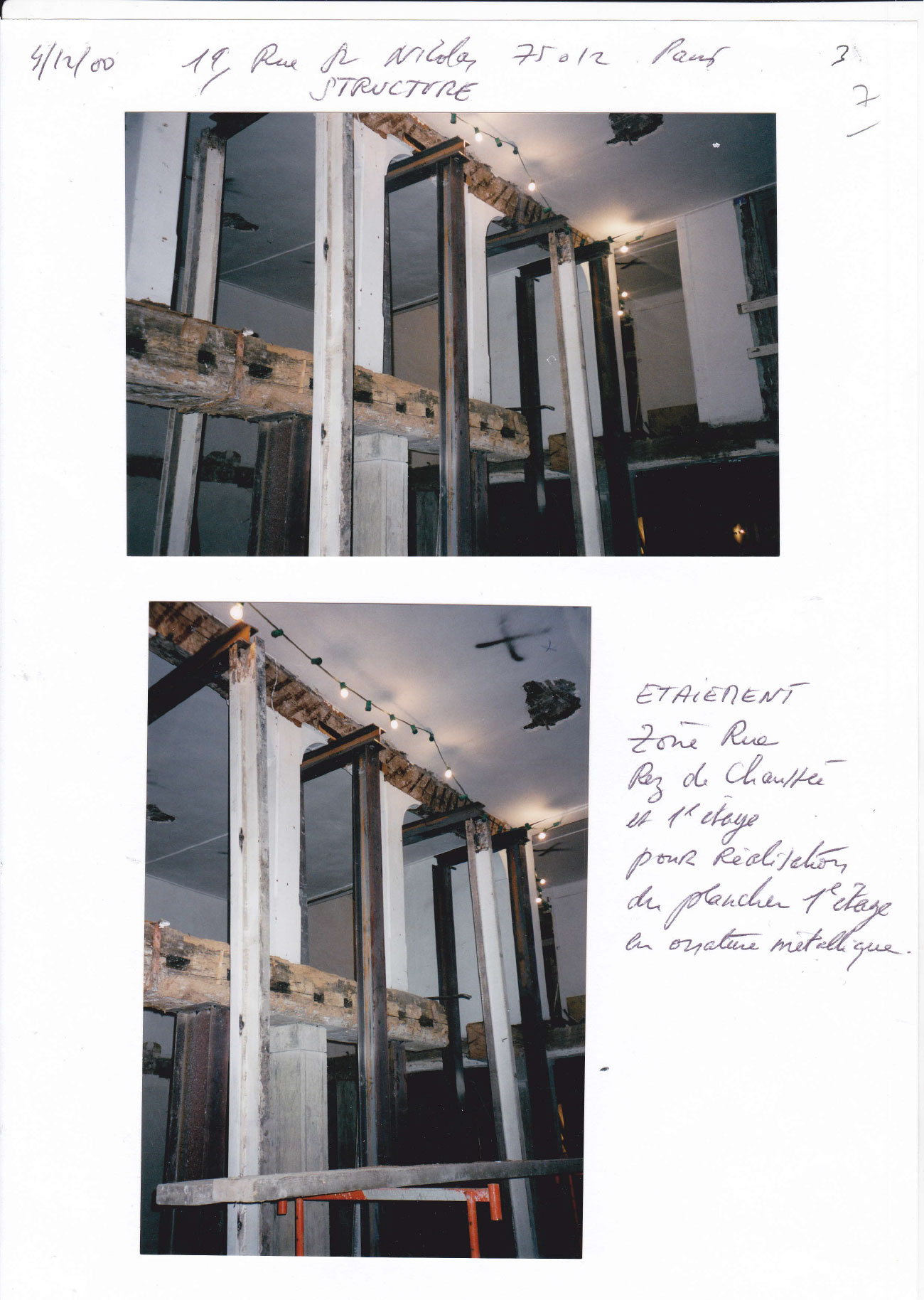 Puis la suite s’enchaîne avec la structuration du magasin sur rue en creusant pour permettre une hauteur suffisante au premier étage ,poteaux béton ,cloisonnement avec le couloir d’entrée ,structure métallique et plancher métallique avant dalle en Décembre 2000 puis le début des passerelles étage par étage en structure métallique et dalle béton jusqu’à la dernière au 5éme avec l’élévation au fur et à mesure de la cage d’ascenseur avec trémie pour le passage de l’escalier .