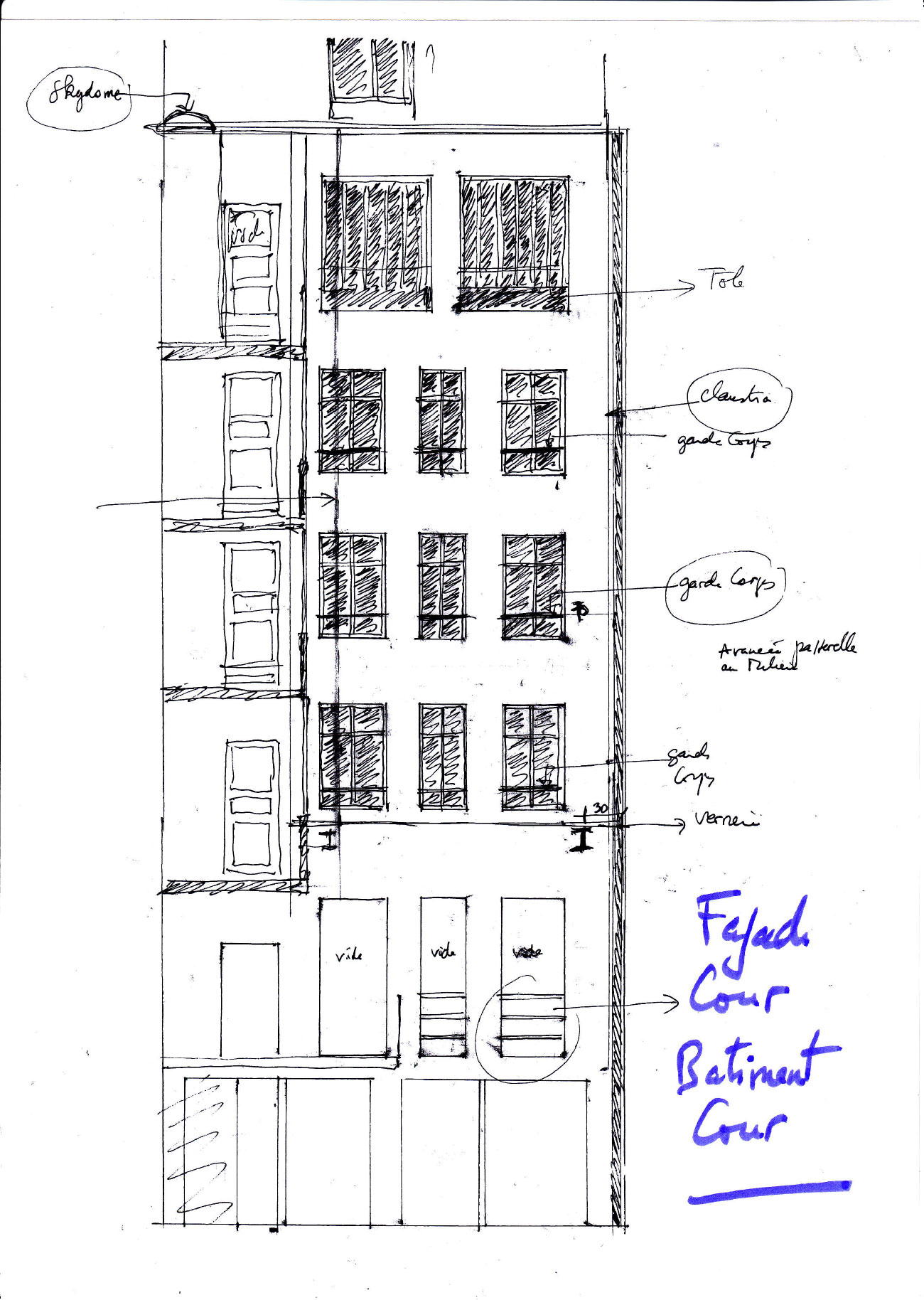 Au niveau des fenêtres sur les passerelles des parties communes, elles sont métalliques avec une partie en verre spéciaux contre l’incendie ainsi que sur la façade cour bâtiment rue avec du double vitrage ; la même chose au niveau des grandes fenêtres du bâtiment cour au 5éme étage.