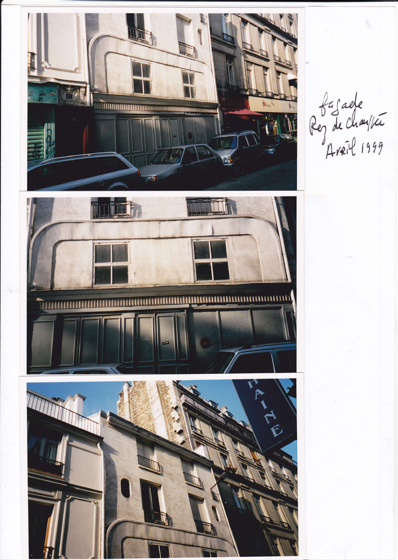 Le dossier présente des photos du projet fini Fin Octobre 2001 pour le magasin et début 2002 pour habiter, des photos en cours de chantier puis des documents graphiques issus du permis de construire et des études sur différentes parties et quelques photos de l’état des lieux en avril 1999 .