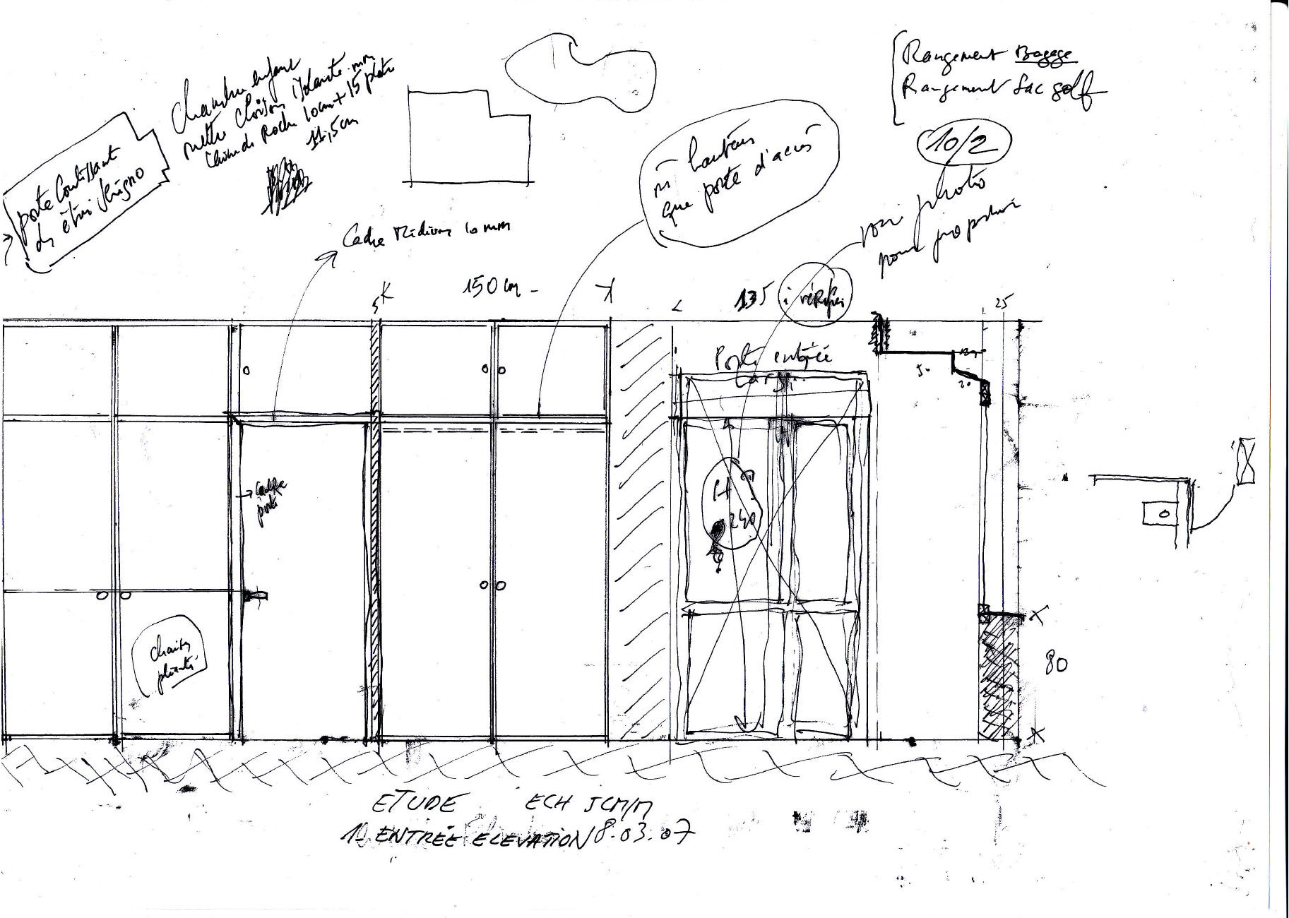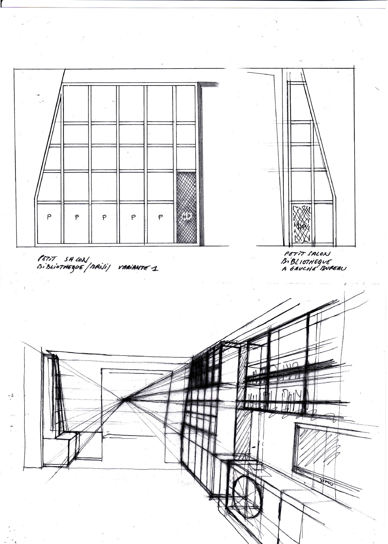 Tout un ensemble de dessins, croquis et perspectives ont été dressés depuis les plans d’ensemble, puis par zones, les meubles bibliothèques et dressing, cuisine et divers.