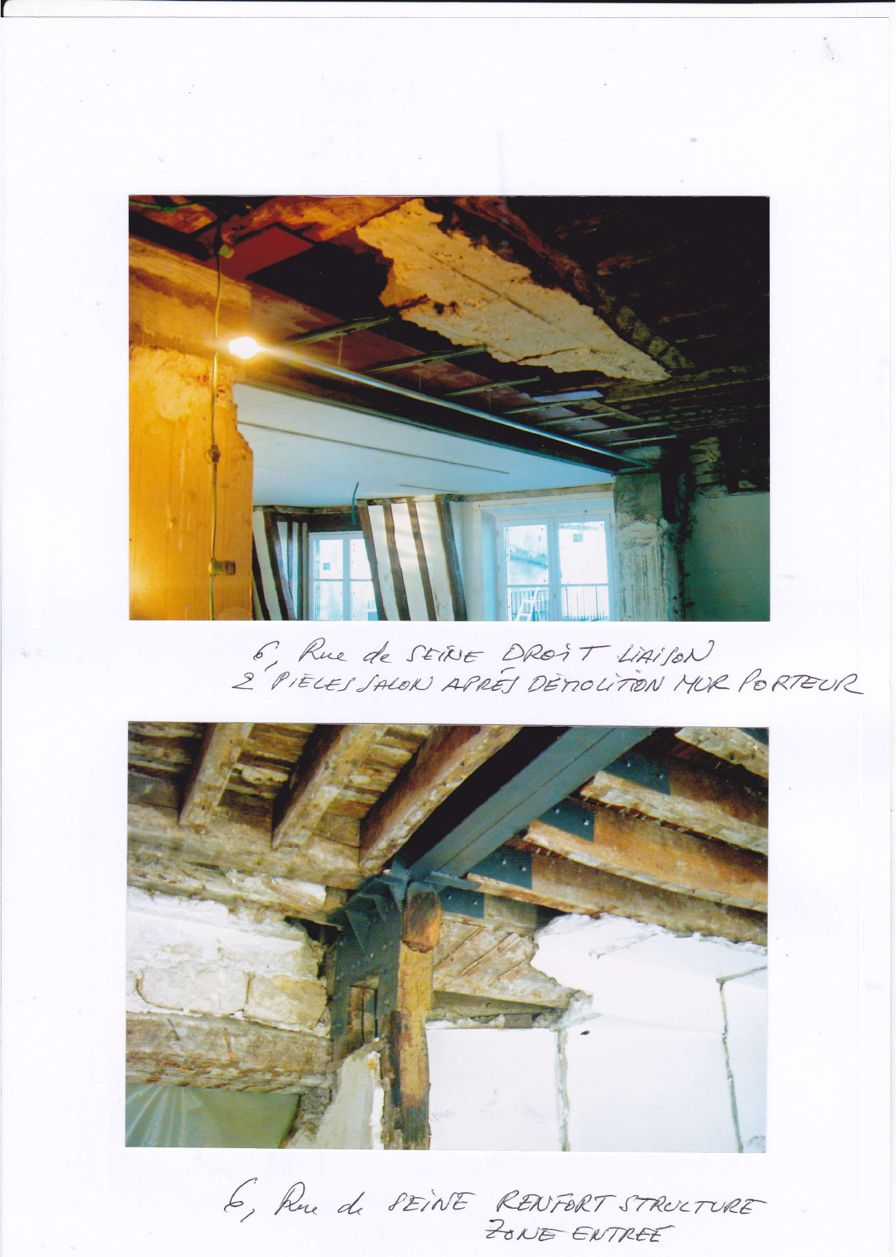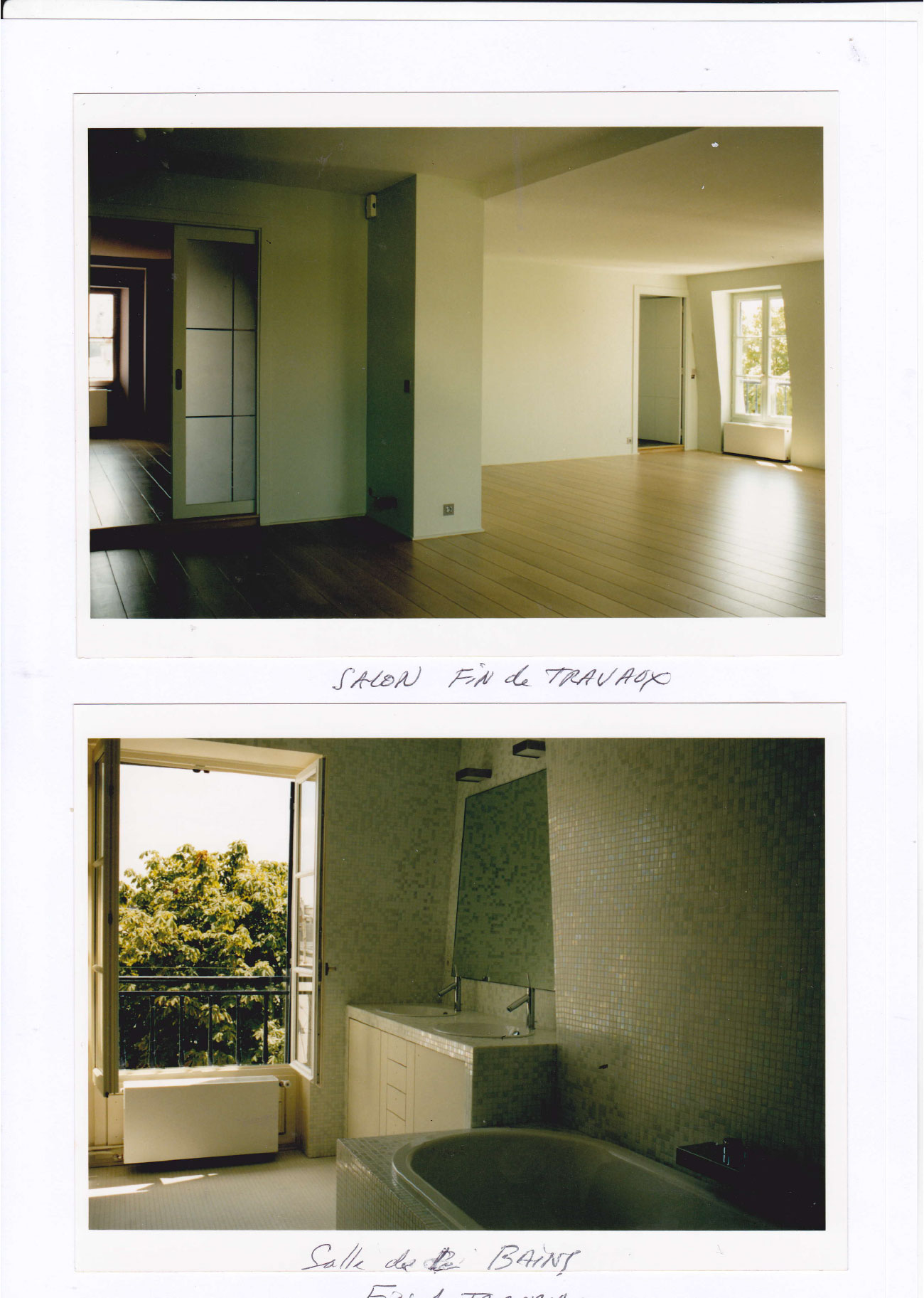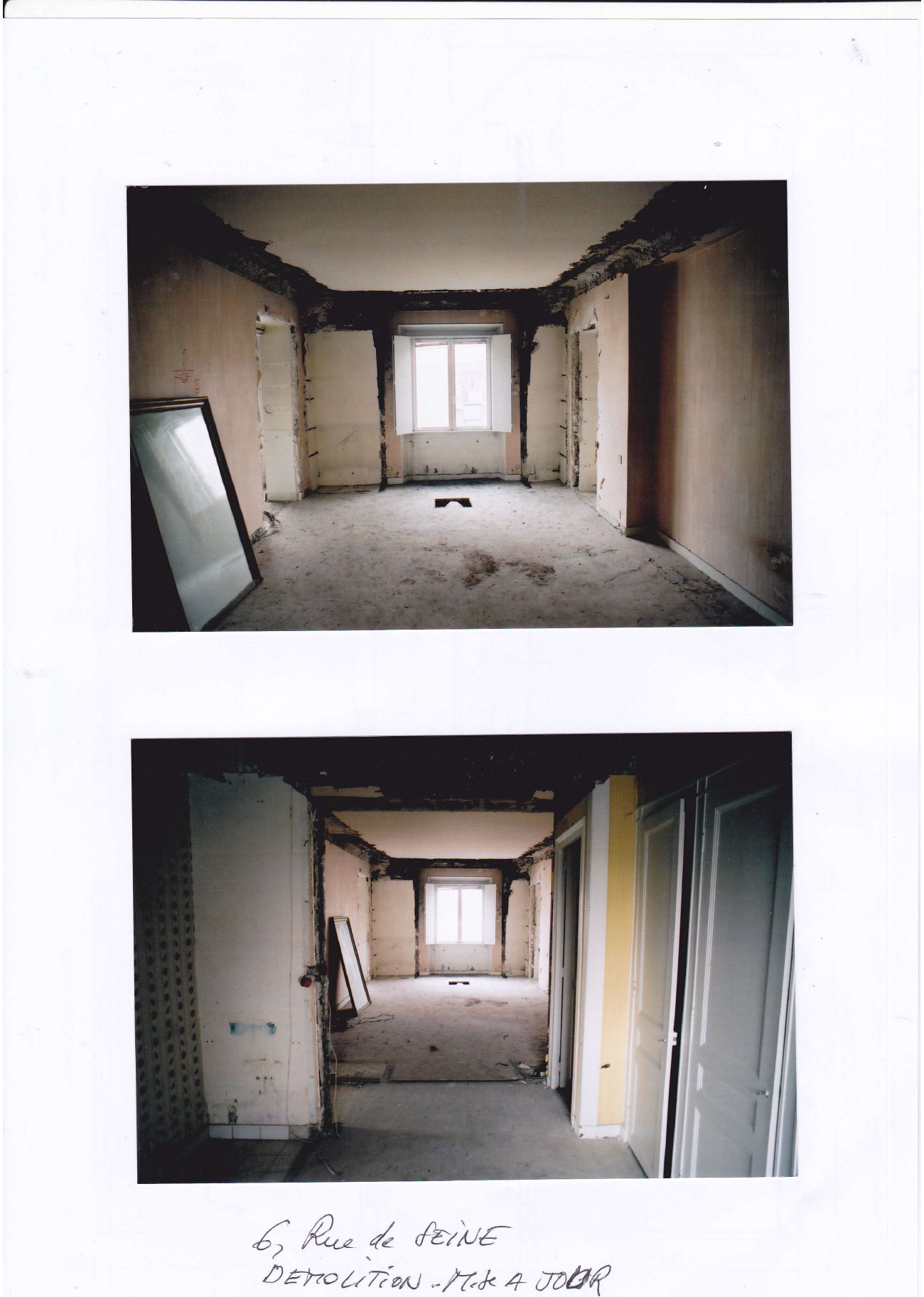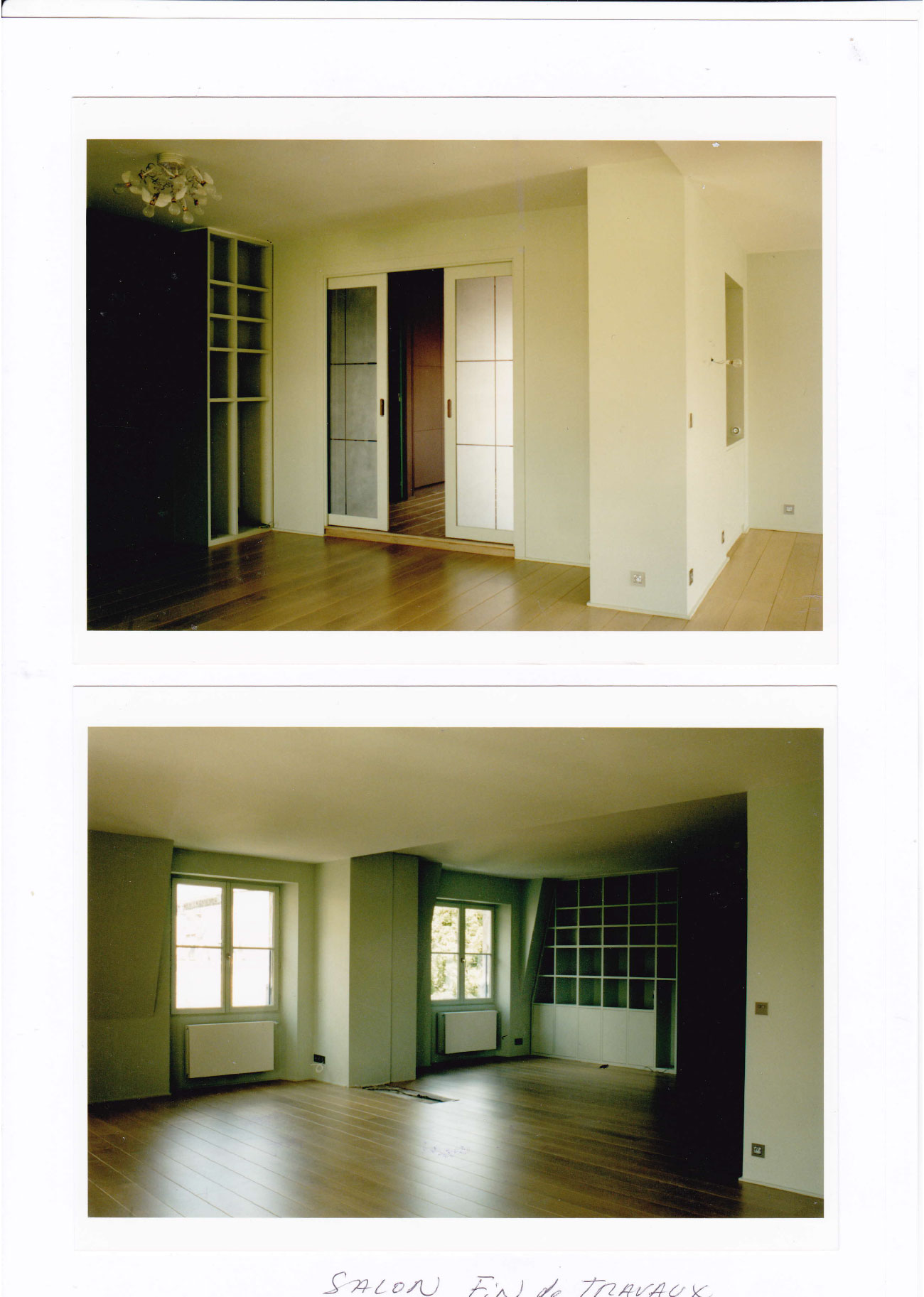 Je me rappelle précisément le moyen d’évacuer les eaux vannes du WC existant de l’entrée pour rejoindre un autre coté ,sans descente collective, se jetait dans la gouttière !(d’où au départ une partie du plancher de la cuisine existante surélevé ),des conduits de cheminées des étages inférieurs à repérer et démolir après accord des copropriétaires tout çà avec des essais fumigènes Puis sur le plan structure des reprises importantes dans les poutres du séjour par des renforts métalliques et surtout la suppression d’un mur porteur entre salon et petit salon où il n y a pas de retombées entre les 2 pièces grâce à une solution de l’entreprise de charpente que je ne connaissais pas .Le résultat est qu’il n’y a aucune différence entre les pièces ,ce qui entraîne un bel espace où l’œil n’est pas arrêté et aussi pour le souvenir le traitement du sol en acoustique vis-à-vis du propriétaire de l’étage en-dessous avec coulage d’une chape liquide depuis la préparation dans la cour et avec pompe et tuyau dans l’escalier de service pour réaliser le travail .
