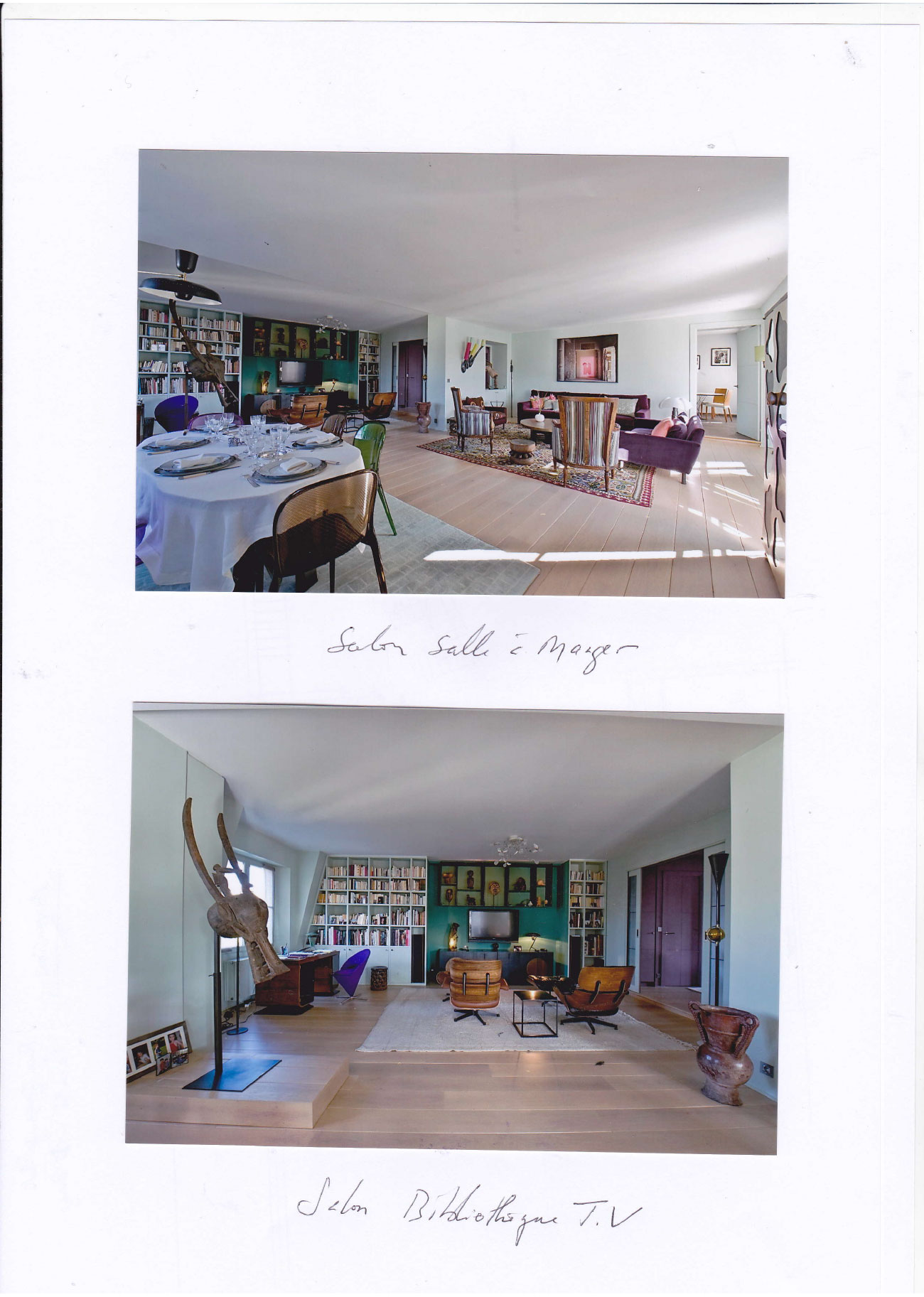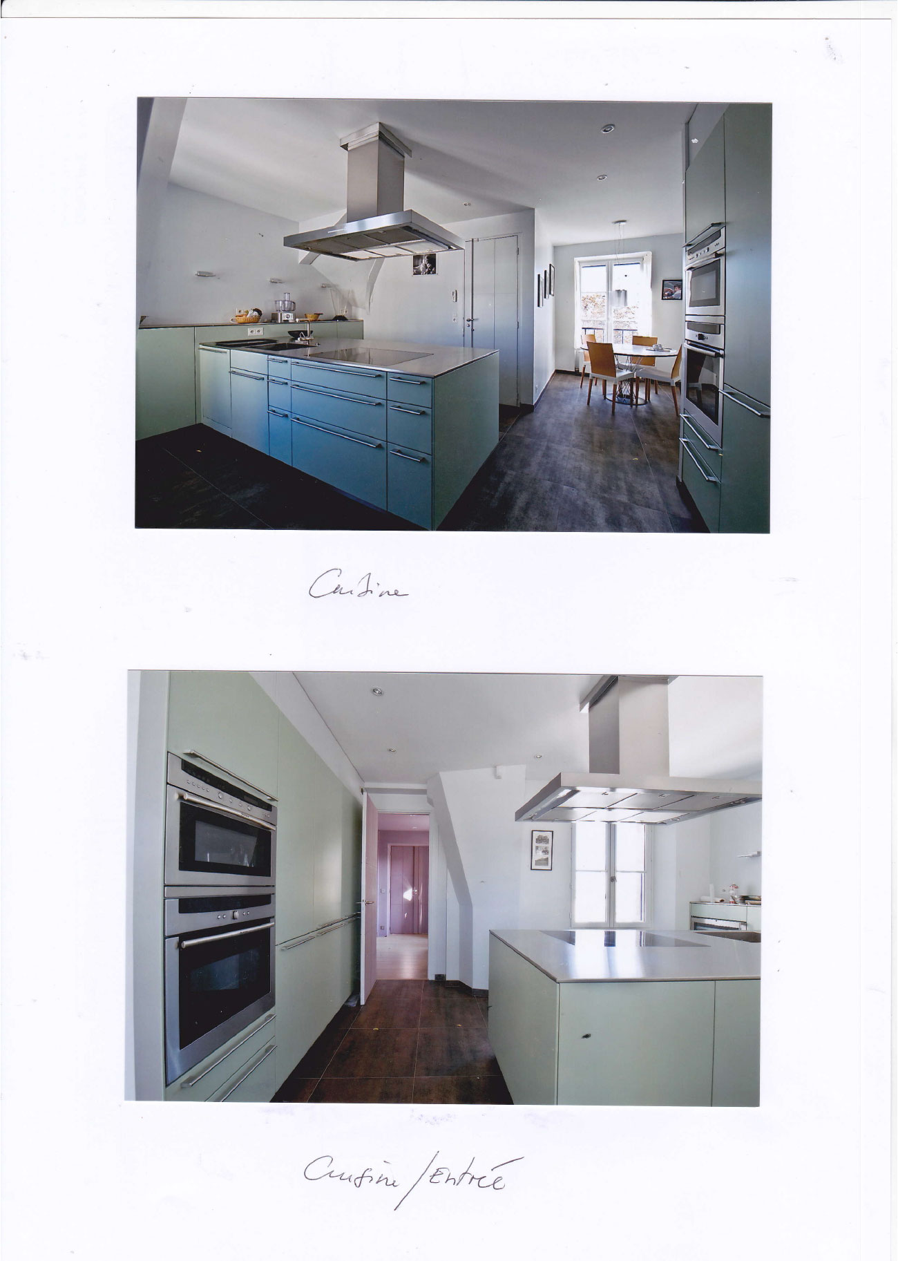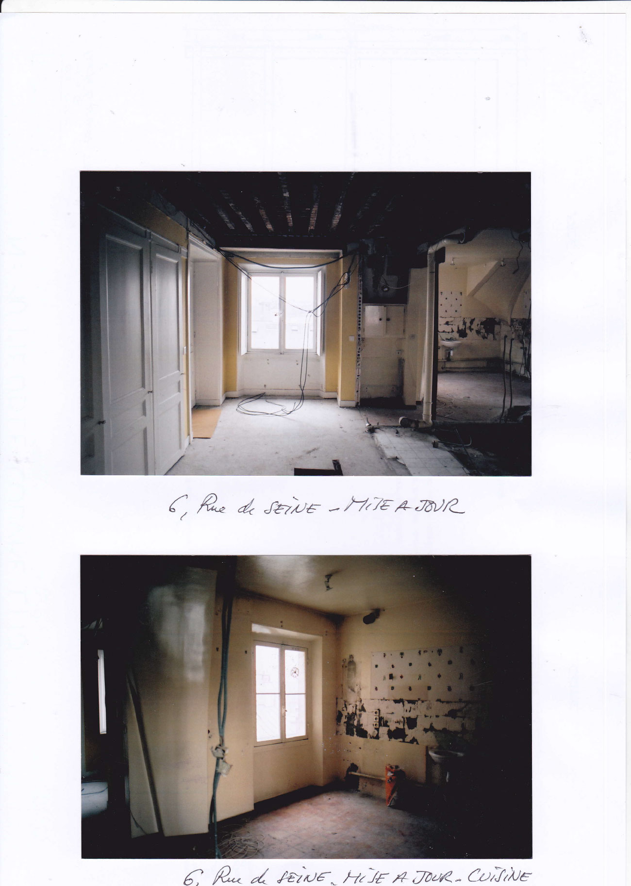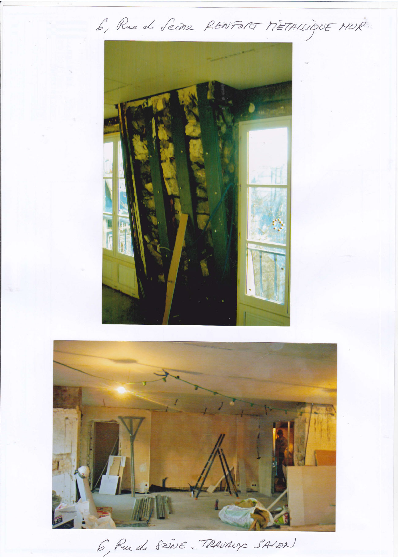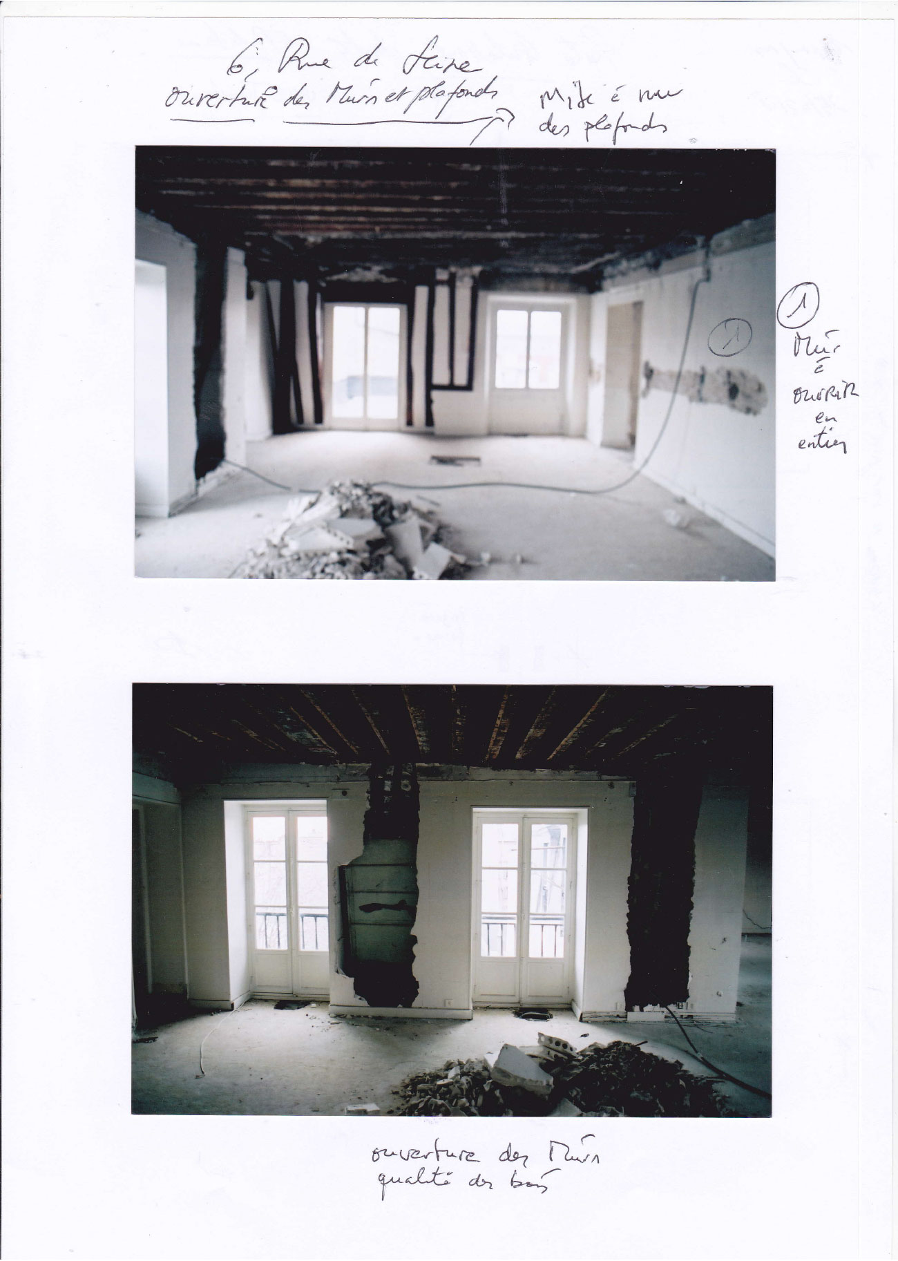 Je me rappelle précisément le moyen d’évacuer les eaux vannes du WC existant de l’entrée pour rejoindre un autre coté ,sans descente collective, se jetait dans la gouttière !(d’où au départ une partie du plancher de la cuisine existante surélevé ),des conduits de cheminées des étages inférieurs à repérer et démolir après accord des copropriétaires tout çà avec des essais fumigènes Puis sur le plan structure des reprises importantes dans les poutres du séjour par des renforts métalliques et surtout la suppression d’un mur porteur entre salon et petit salon où il n y a pas de retombées entre les 2 pièces grâce à une solution de l’entreprise de charpente que je ne connaissais pas .Le résultat est qu’il n’y a aucune différence entre les pièces ,ce qui entraîne un bel espace où l’œil n’est pas arrêté et aussi pour le souvenir le traitement du sol en acoustique vis-à-vis du propriétaire de l’étage en-dessous avec coulage d’une chape liquide depuis la préparation dans la cour et avec pompe et tuyau dans l’escalier de service pour réaliser le travail .