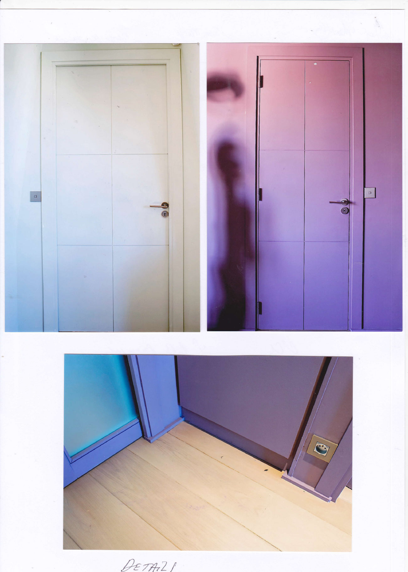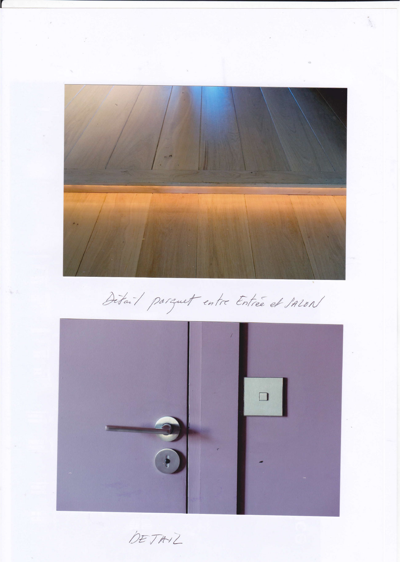Un souci du détail a porté sur le dessin des portes et encadrement, porte coulissante entrée-sortie, le choix des commandes électriques, les mosaïques /calepinage dans la salle de bains 1, choix du parquet et essais de teinture.